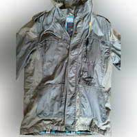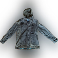 Sleek gray jacket with a hood. Ideal for everyday wear. In grey condition except for hole in hoodie