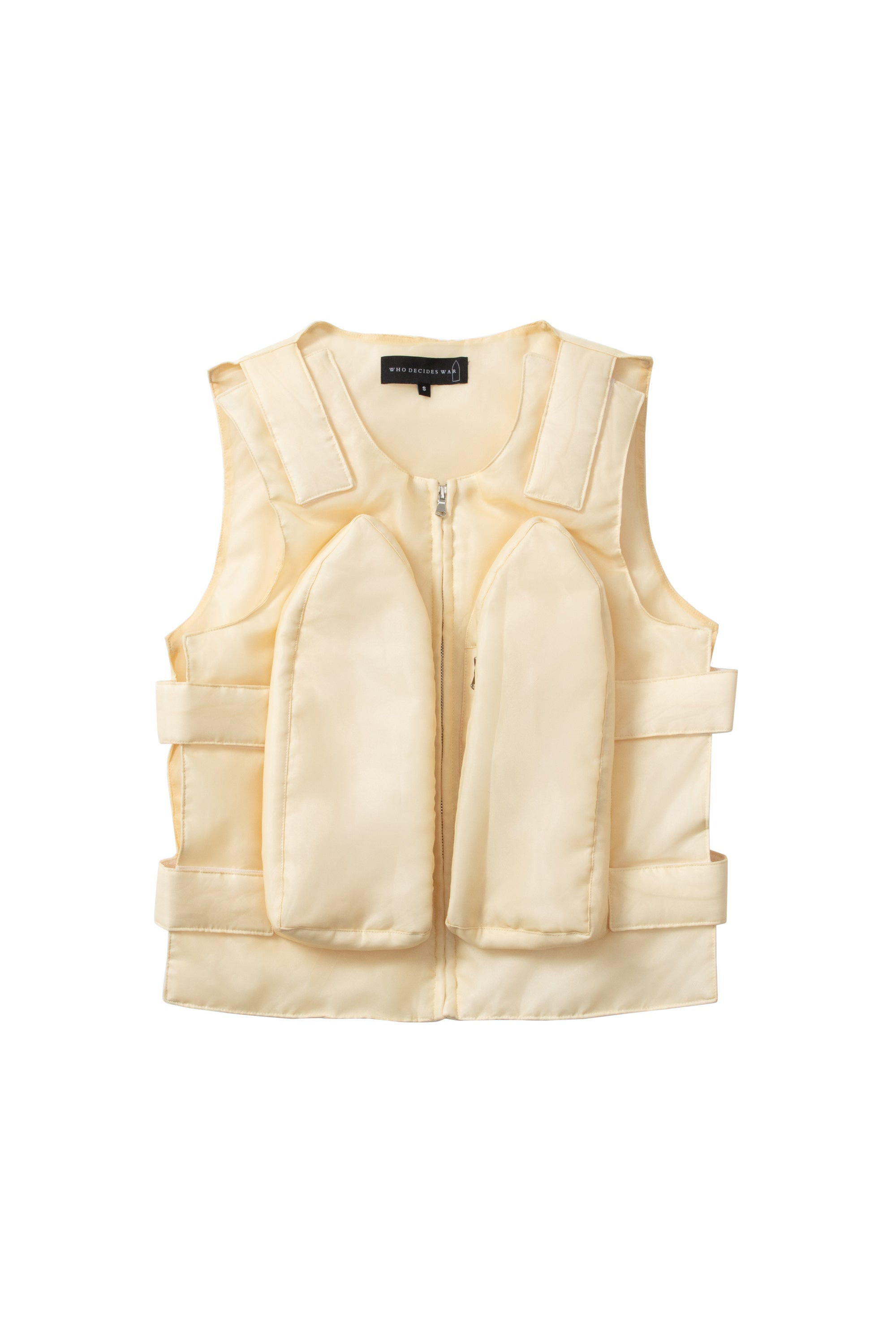 The Bullet Point Vest is comprised out of 100% authentic organza and lined with the same self. The vest features stained glass window cargo pockets and adjustable straps. Featuring an original boxy and slightly cropped fit, following your normal size is recommended. Processing takes 1-2 days, shipping in the US 3-4 days, internationally 7-10 days.
