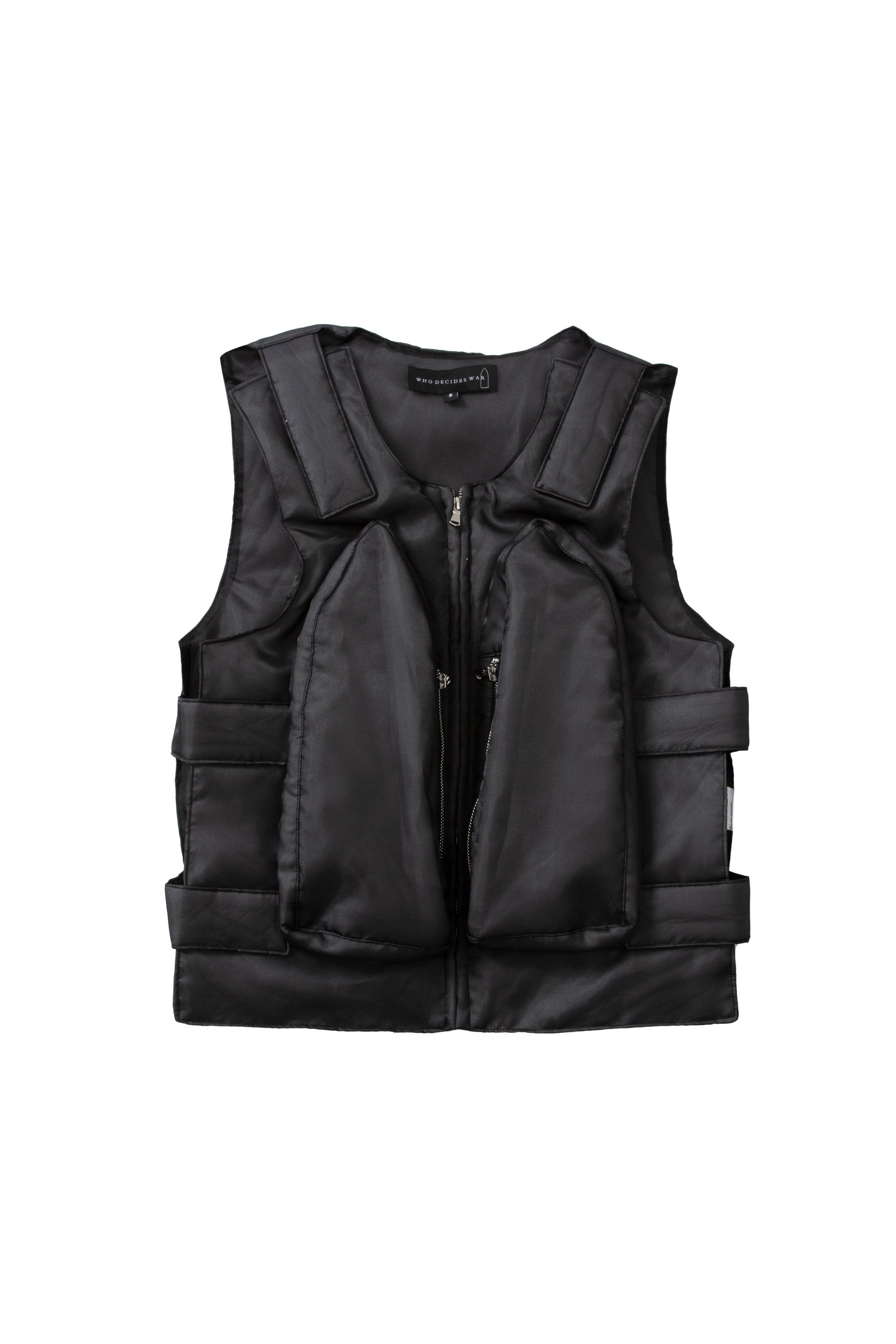 The Bullet Point Vest is comprised out of 100% authentic organza and lined with the same self. The vest features stained glass window cargo pockets and adjustable straps. Featuring an original boxy and slightly cropped fit, following your normal size is recommended. Processing takes 1-2 days, shipping in the US 3-4 days, internationally 7-10 days.