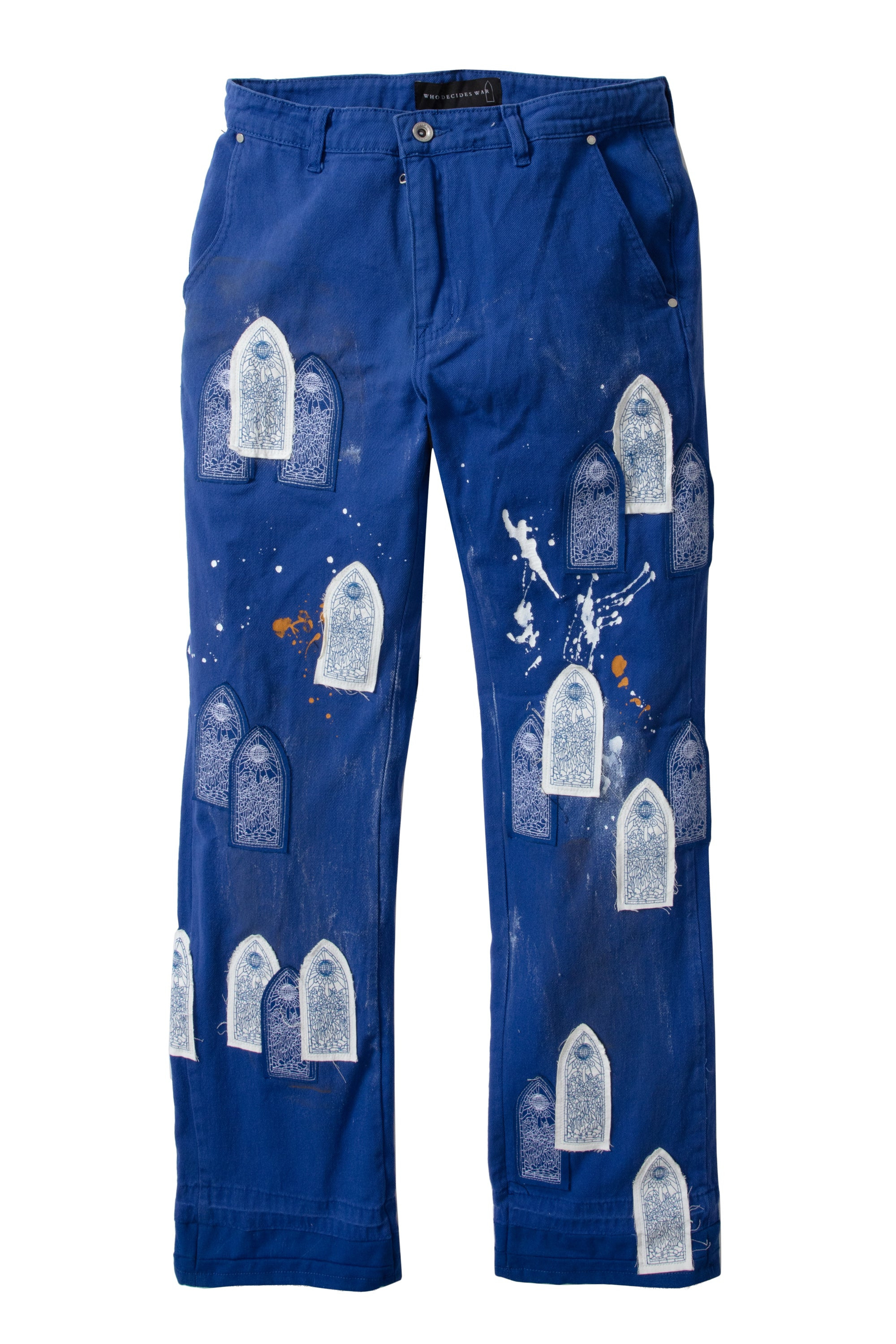 The Sky Painter Carpenter Pant are comprised of 100% cotton and feature a slim straight fit. They have an inseam of 35.5 inches and are embellished with paint splatter, a vintage wash, and original mini stained glass patches throughout the garment. The wash is intended to emulate a vintage worn and worked-in effect. Follow your normal size. Processing takes 1-2 days, shipping in the US 3-4 days, internationally 7-10 days.