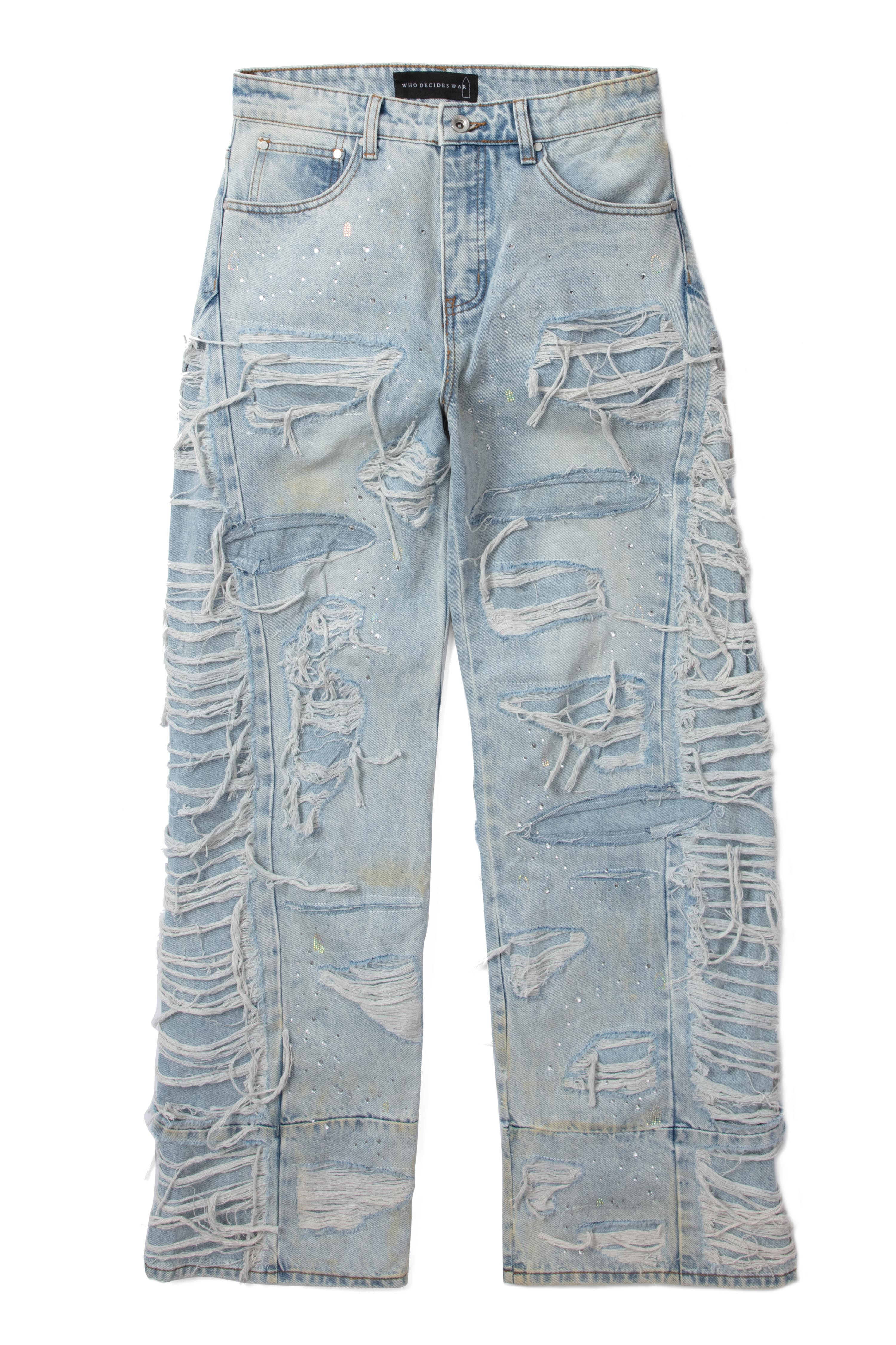 The Ultra Flare Distressed Denim are comprised of 100% cotton and feature a baggy fit. The pants feature an inseam of 35.5 inches and are embellished with rhinestones, distressing and darning throughout. Follow your normal size. Processing takes 1-2 days, shipping in the US 3-4 days, internationally 7-10 days.