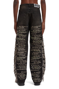 Our Ultra Flare Scripture Denim is 100% cotton and features an oversized fit thanks to the flared leg opening. The color wash is designed to fade in prominent panel areas. All-over embroidery, distressing, and rhinestone appliques are present throughout the pant legs. The inseam follows our standard length of 35.5, and we recommend you stick with your normal sizing. Processing takes 1-2 days, shipping in the US 3-4 days, internationally 7-10 days.