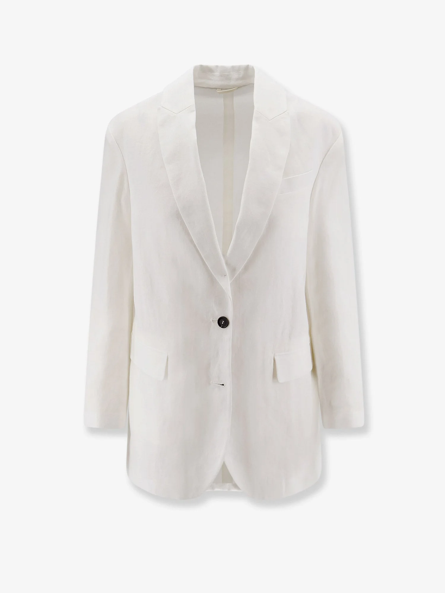 Brand: BRUNELLO CUCINELLI Product reference: MQ9867292 Color reference: C001 Color: White Gender: Woman Category: Blazer and Gilet Made in: ITALIA Size Info: IT sizing. Info: Two-button closure with black buttons Flap pockets Chest pocket Peak lapel Monile detail on the back Made in Italy 100% cotton SKU: MQ9867292C001 Why Shop With Us · 100% Authenticity Guaranteed · Brand-New, Unworn Items Only · Original Retail Packaging Included · Fast, Reliable Shipping · Excellent Customer Service
