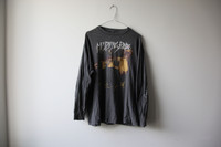 Vintage My Dying Bride – “Hail The King” Long Sleeve T-Shirt (1992) – Rare Doom Metal Tee Original 1992 My Dying Bride long sleeve shirt featuring the “Hail the King” design. An authentic piece of early 90s doom/death metal history — not a reproduction. Essential for collectors of extreme metal and rare long sleeve band tees. Front Design: Large “Hail the King” artwork across the chest with My Dying Bride’s classic gothic logo above. Sleeves: Printed graphics/text down both sleeves Back Design: Printed back hit Item Details: Year: 1992 Band: My Dying Bride Design: Hail the King Style: Long sleeve Size: XL Color: Black Material: 100% Cotton Vintage original – not a reprint Measurements (approximate): Pit to Pit: 23.5 Length: 27.5 Condition: faded, repairs left armpit, hem stitch undone, small hole front left stomach, neckline little undone stitching, Why This Shirt? Authentic early 90s doom/death metal shirt Rare My Dying Bride long sleeve from their formative era Highly collectible for fans of Peaceville Three (My Dying Bride, Paradise Lost, Anathema) Increasingly hard to find in wearable condition