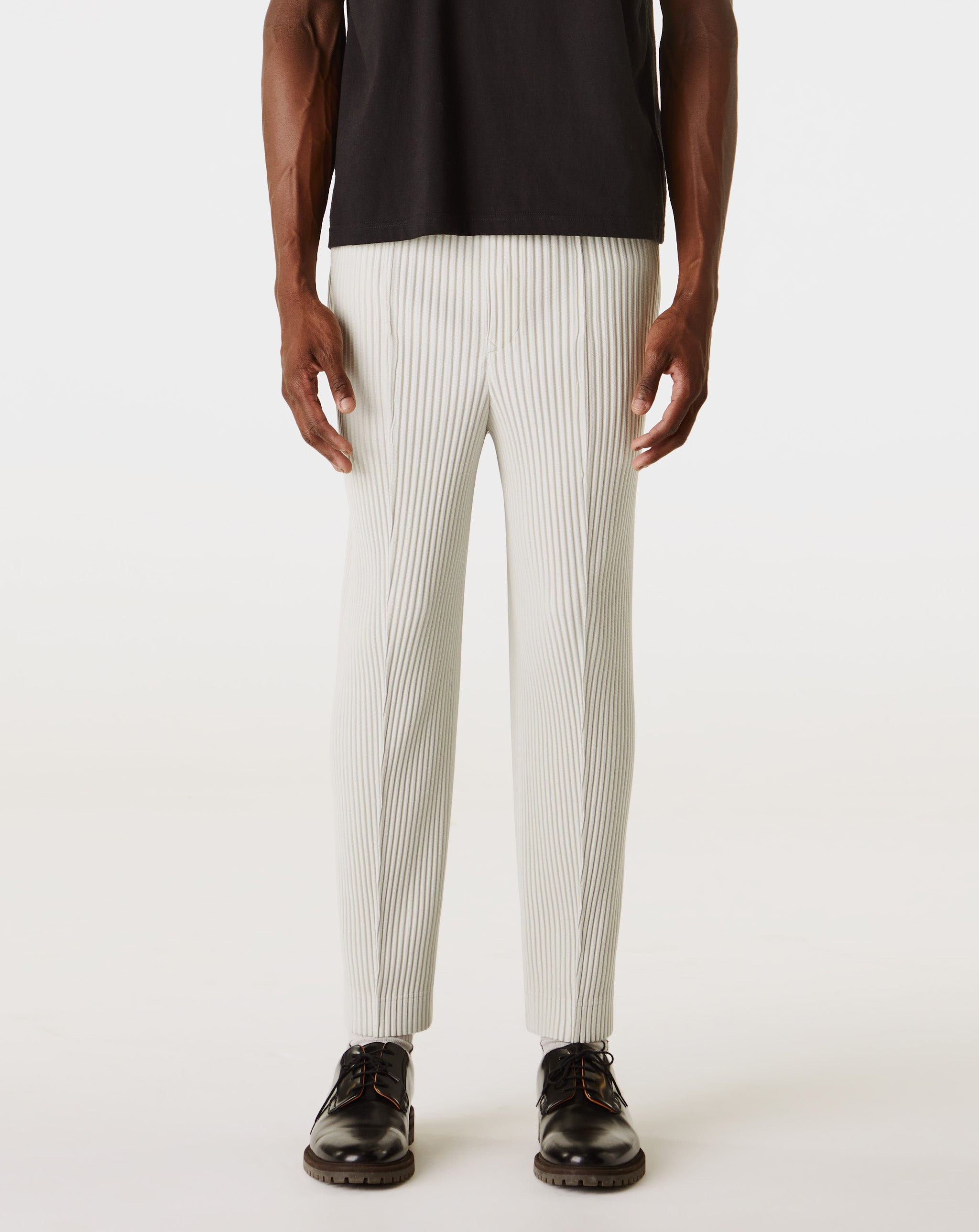 The Homme Plisse Issey Miyake Compleat Trousers showcase signature pleating in a relaxed silhouette with a structured button fly. An elastic waist with drawcord and belt loops blend comfort with sharp detail. - Relaxed fit - Signature all-over pleating - 2-pocket style - Elasticized waist with interior drawcord - Style #: HP58JF140-10 Product Details: • Model is 6’4”, wearing a size 3. • Size 3 measures 30" around the waist and 28" at the inseam. • 100% Polyester • Made in the Philippines. • Color: Strata Grey