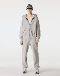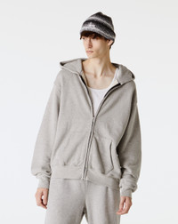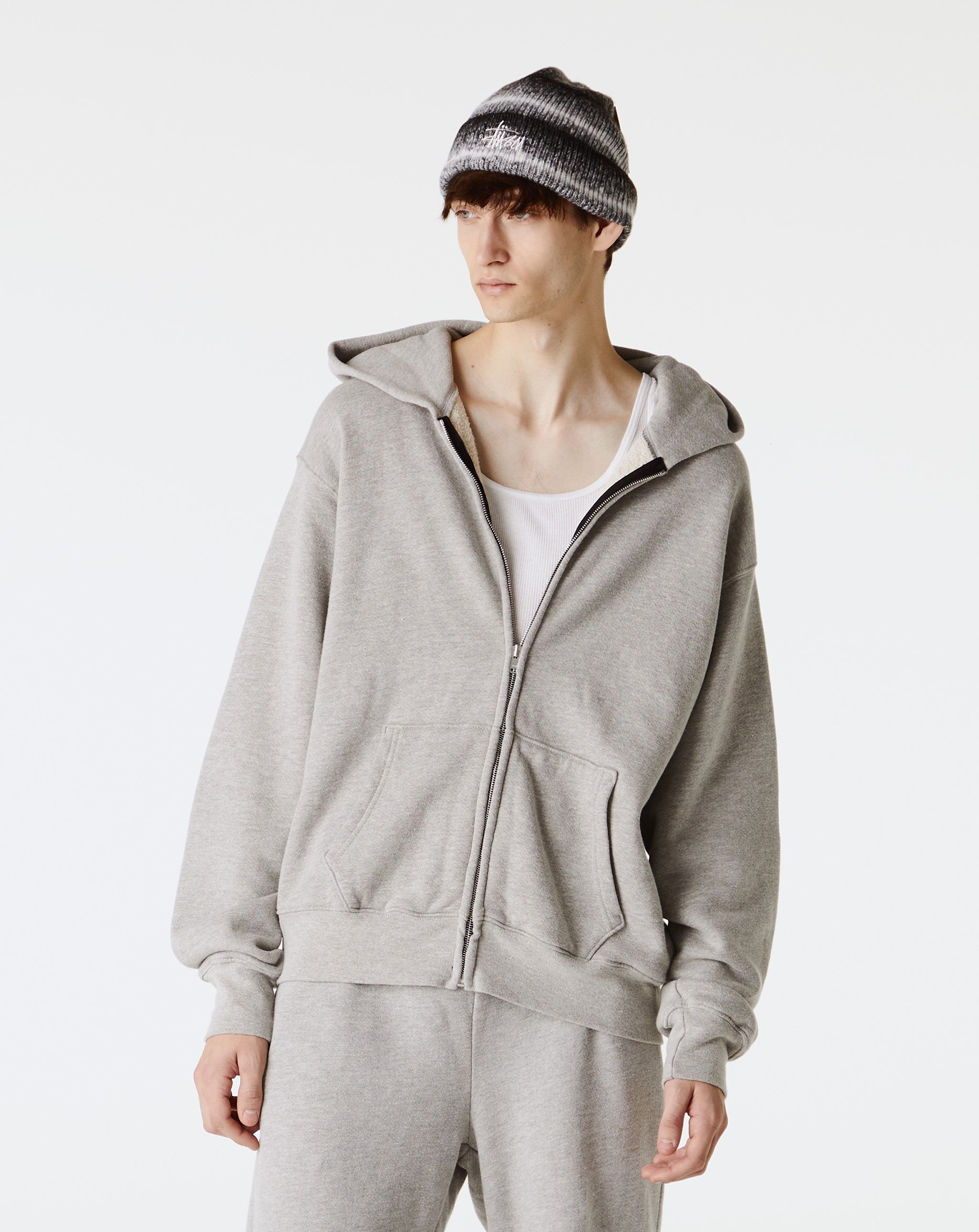 Vintage style heavyweight full-zip hoodie from Les Tien. - Each piece rubbed with a steel brush to produce a vintage look and feel - Split front kangaroo pockets - Front RIRI zipper closure - Gold plated Cobrax grommets - Classic relaxed fit - Model is 6'2", wearing a size L. - Size L measures 24” pit-to-pit and 27” neck-to-hem. - 100% Cotton. - Made in the United States - Color: Heather Grey - Style #: CF-1011-HEG