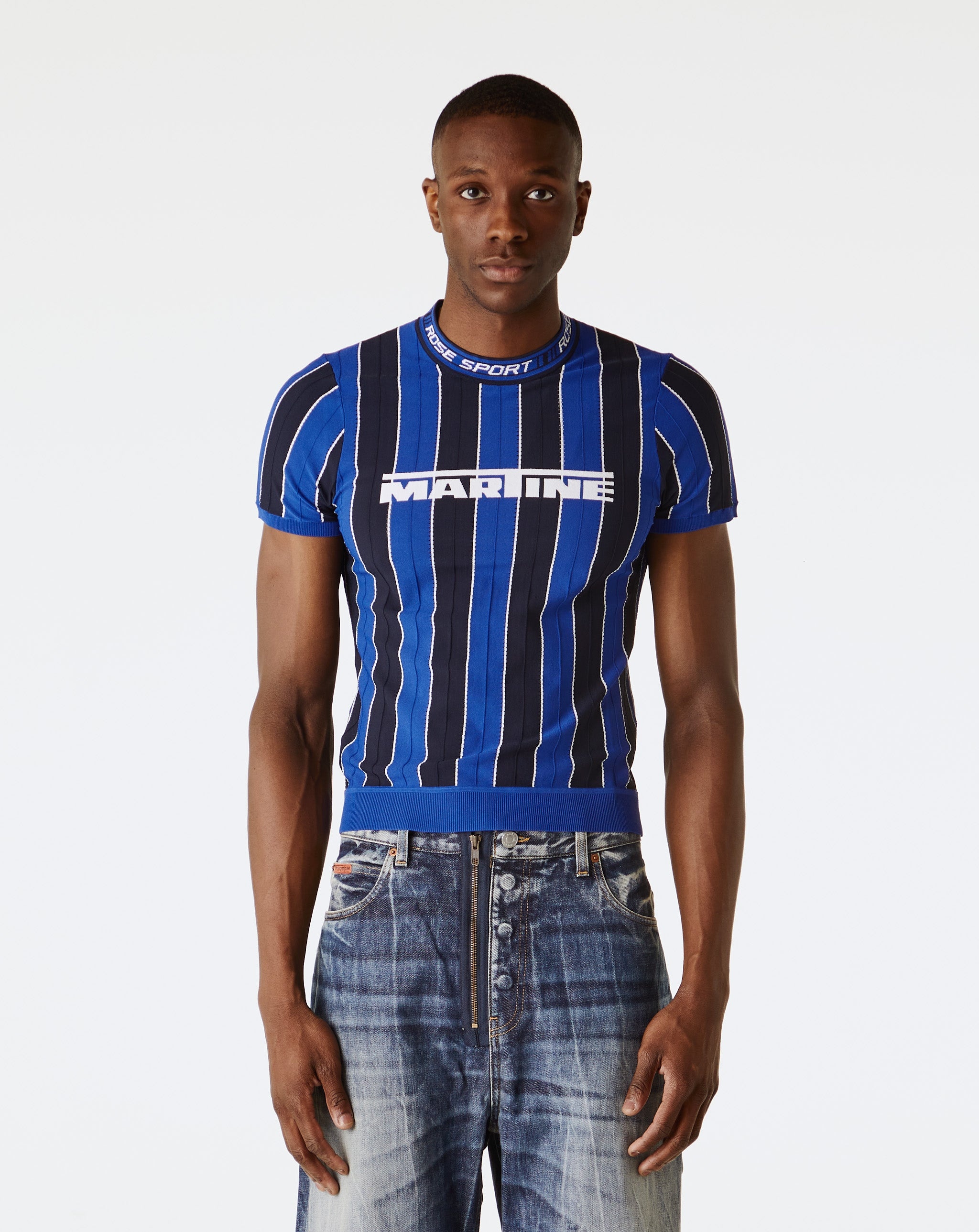 The Martine Rose Logo Tight T-Shirt is a sleek, fitted tee with a bold logo on the chest and graphic stripe detailing. Printed neck accents and ribbed hem add a touch of flair. - Logo on the chest - Printed detailing on the neck - Stripe detailing - Style #: 959YA12500-BLU Product Details: • Model is 6'3", wearing a size L. • Size L measures 17.5" from pit-to-pit and 23" from neck-to-hem. • Color: Blue