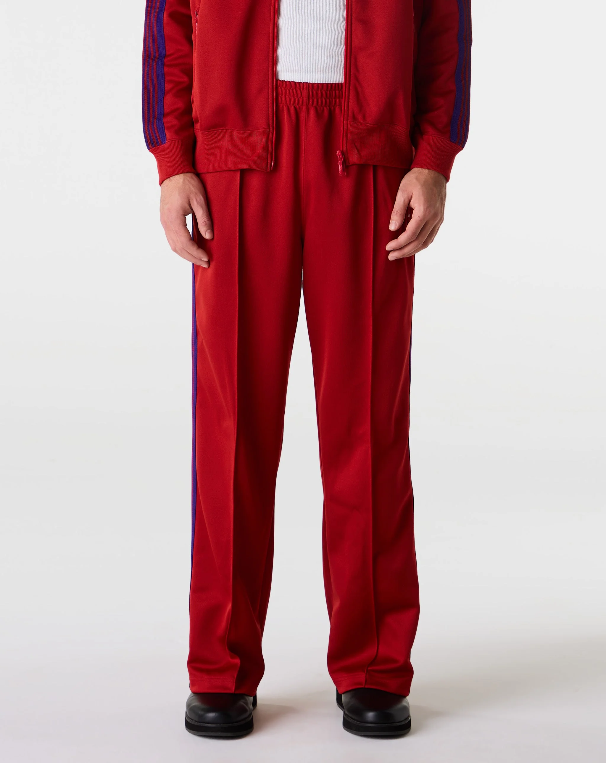 The Needles Track Pant delivers a relaxed fit with striped taping on the sides and a clean three-pocket layout. Its polyester build, elasticated waistband, and subtle logo create a sharp, easy-wear pant. - Relaxed fit - Logo on left leg - Striped taping on the sides - Three-pocket style - Elasticated waistband - Style #: RW316-C Product Details: • Model is 6'2", wearing a size L. • Size L measures 33" around the waist and 30" at the inseam. • 100% Polyester • Made in Japan. • Color: Red