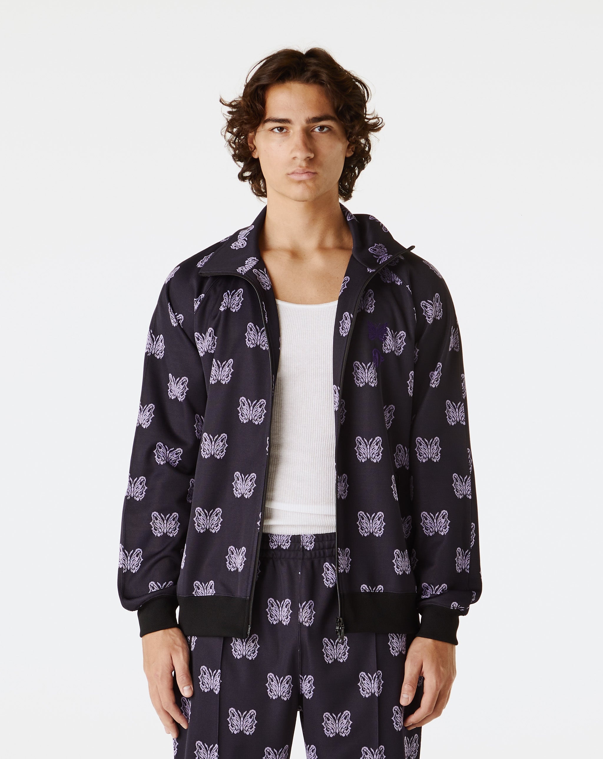 The Needles x Kae Tanaka Track Jacket features a relaxed fit with all-over printed detailing and a stand-up collar. Made from polyester with a full zip closure, it fuses art and streetwear in a bold silhouette. - Printed detailing throughout - Full zip-up closure - Slit pockets on the sides - Ribbed cuffs and hem - Style #: QV424 Product Details: • Model is 6'1", wearing a size L. • Size L measures 22" from pit-to-pit and 26.5" from neck-to-hem. • 100% Polyester • Made in Japan. • Color: Black