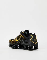 The Nike Shox TL takes mechanical cushioning to the next level. A recrafted version of the 2003 icon, it features breathable mesh in the upper and full-length Nike Shox technology for optimal impact absorption and a bold look on the streets. - Nike Shox technology combines resilient, flexible columns with moderator plates for outstanding cushioning that compresses and regains its shape. - A combination upper with a full TPU cage is a near-exact replica of the 2003 Nike Shox TL. - Molded overlays throughout the midfoot provide support and a snug fit. - A TPU plate in the heel between the midsole and Nike Shox technology helps provide lateral stability and support. - A foam midsole provides lightweight cushioning. - Non-marking, solid rubber in a modified waffle outsole gives great traction and durability. - Style #: AV3595-013 Product Details: • Listed in U.S. Men's Sizes. • Color: Black | University Gold