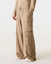 The DRKSHDW Double Cargo Jumbo Belas feature a wide-leg design with multiple cargo and back patch pockets. Crafted from cotton, these pants combine a relaxed fit with functional detailing. - Relaxed fit - Multiple cargo pockets - Back patch pockets with flaps - Elasticated drawstring waistband - Wide-leg design - Style #: DU02E7398-CFL-88 Product Details: • Model is 6'2", wearing a size L. • Size L measures 29" around the waist and 33" at the inseam. • 100% Cotton • Made in Italy. • Color: Dirty Pearl