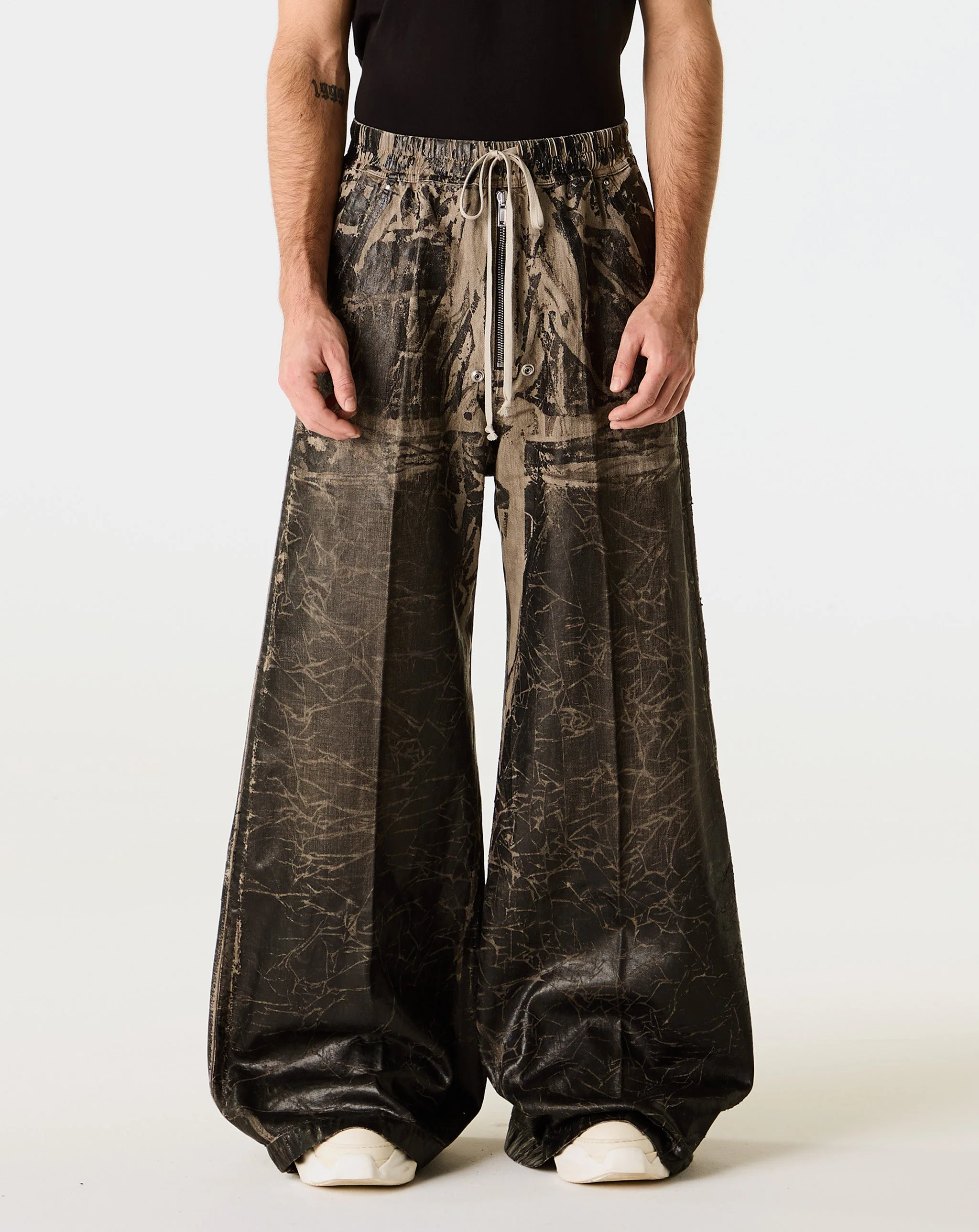 The DRKSHDW Geth Belas pants stand out with their coated, crinkled surface and easy drawstring waist. The wide-leg fit and dual back pockets complete the utilitarian look. - Relaxed fit - Wrinkled coated finish - Double back pockets - Elasticated drawstring waistband - Wide-leg design - Style #: DU02E7378-DWF-59 Product Details: • Model is 6'2", wearing a size L. • Size L measures 28" around the waist and 33.5" at the inseam. • 100% Cotton • Made in Italy. • Color: Black Washed Foil