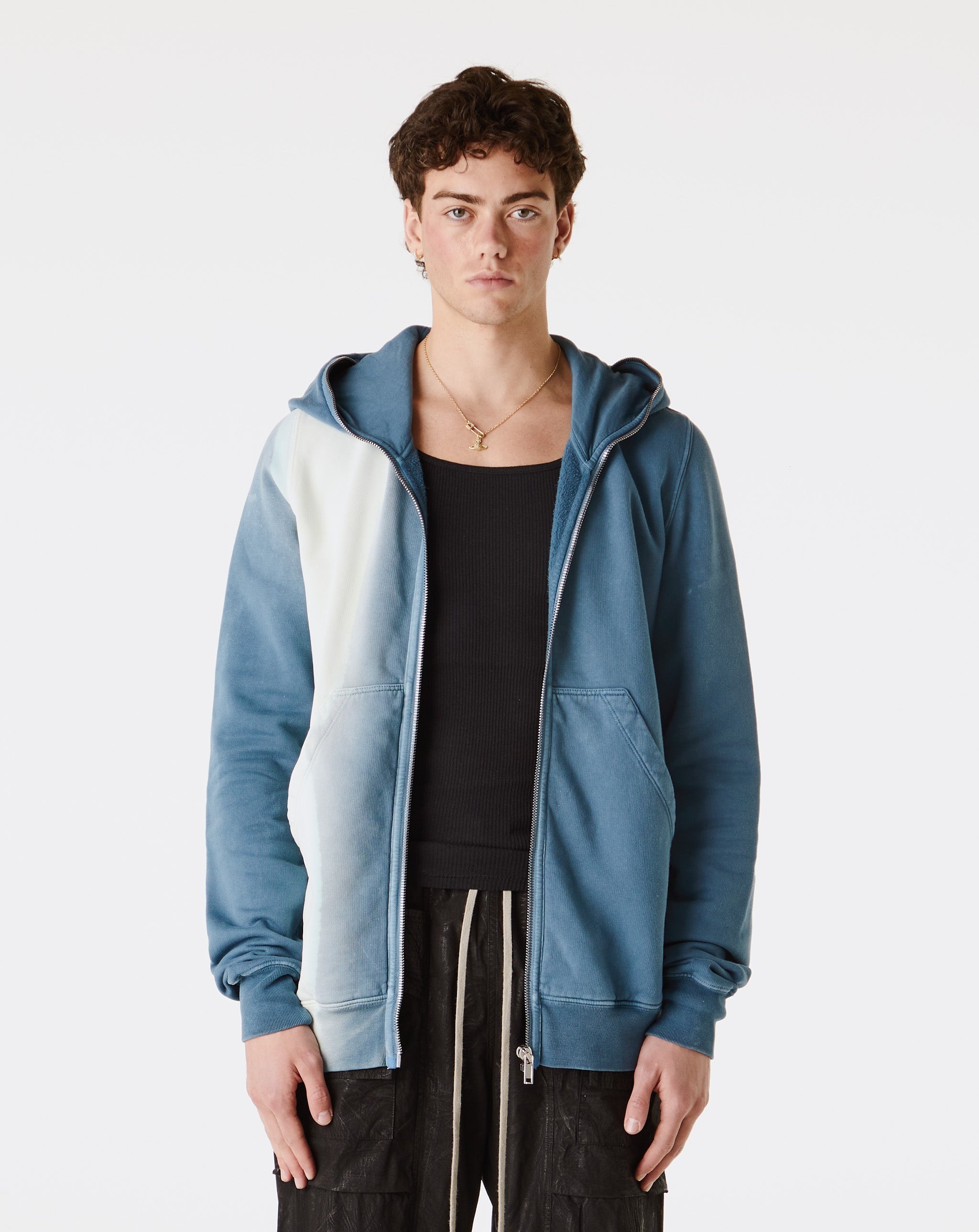 The Rick Owens DRKSHDW Gimp Hoodie features a hooded neckline with a zip closure and a bold side strap accent. Its relaxed fit and ribbed cuffs and hem offer both comfort and street-ready style. - Hooded neckline with zip closure - Side strap - Front zip closure - Front pockets - Style #: DU01E3291-FDEG-86D Product Details: • Model is 6’2”, wearing a size M. • Size M measures 20.5" from pit-to-pit and 28.5" from neck-to-hem. • 100% Cotton • Made in Italy • Color: Toothpaste Degrade