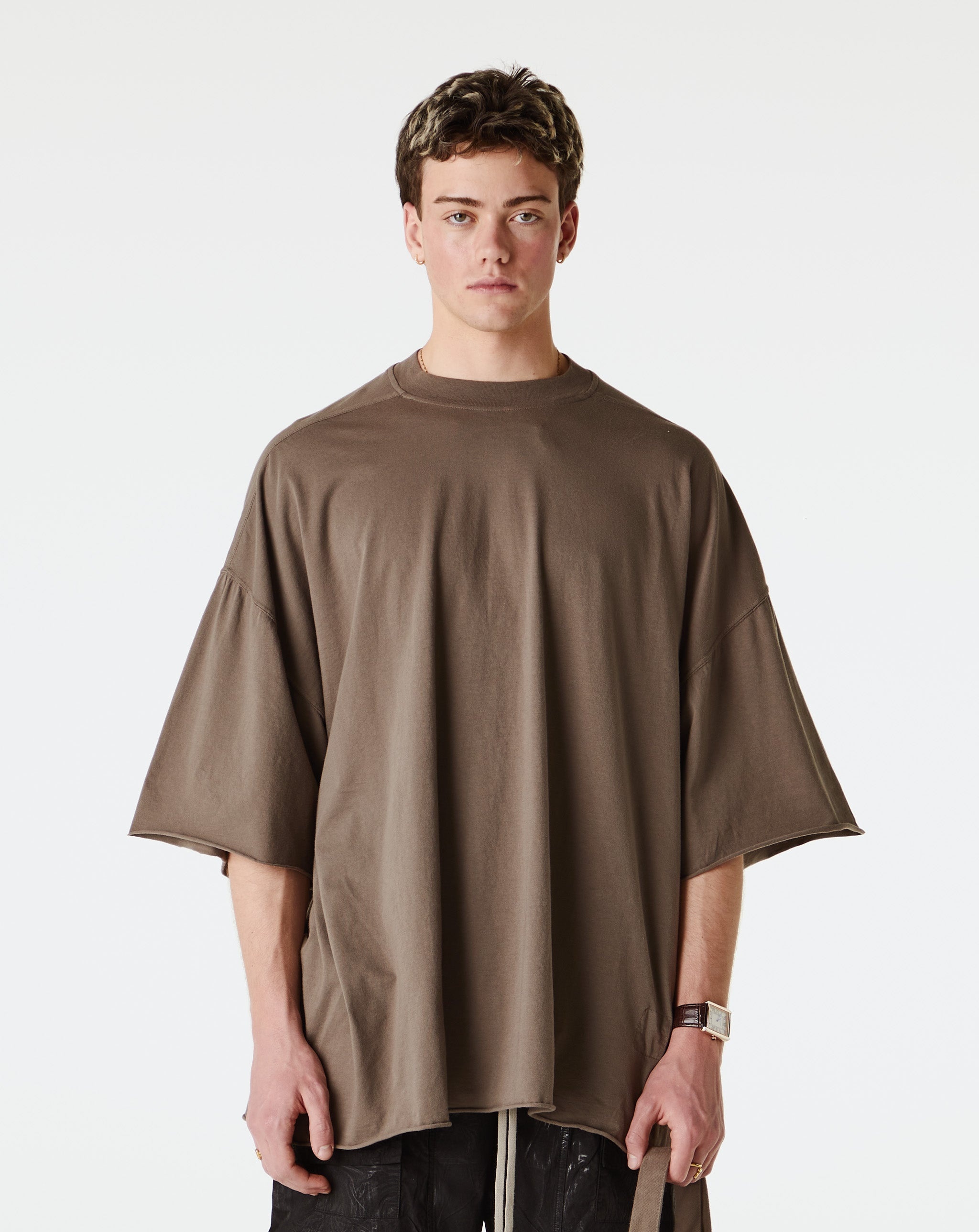 The Rick Owens DRKSHDW Tommy T-Shirt features an oversized fit with drop shoulder sleeves and rolled cuffs for a bold, casual look. The ribbed crew neck adds structure to the relaxed silhouette. - Ribbed crew neck - Drop shoulder sleeves - Rolled cuffs and hem - Style #: DU01E3259-RN-34 Product Details: • Model is 6’2”, wearing a size L. • Size L measures 29.5" from pit-to-pit and 32" from neck-to-hem. • 100% Cotton • Made in Italy. • Color: Dust