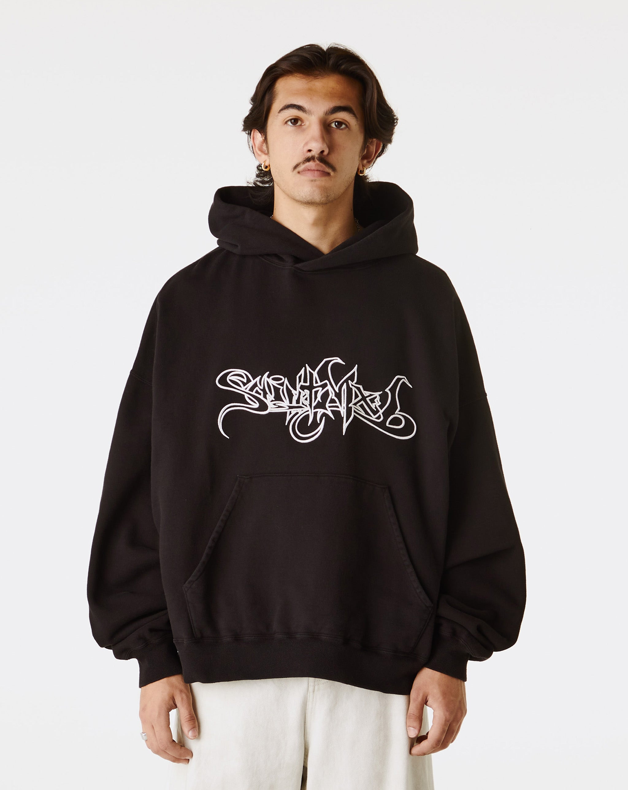 The SAINT Mxxxxxx Saint Mx6 Hoodie is cut in a loose fit and detailed with signature front branding. A cotton construction, ribbed edges, and classic hood round out the staple look. - Relaxed fit - Branded graphic on the front - Classic hood - Kangaroo pocket - Style #: SM-HR8-0000-049 Product Details: • Model is 5'11", wearing a size L. • Size L measures 27" from pit-to-pit and 25.5" from neck-to-hem. • 100% Cotton • Made in Japan. • Color: Black
