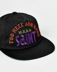 The SAINT Mxxxxxx Sinner Shine Hat stands out with front and back embroidered branding on a structured 5-panel design. Finished with a flat bill, woven eyelets, and an adjustable strap for a bold street look. - Embroidered branding on the front and back - 5-panel style - Woven eyelets - Adjustable strap - Style #: SM-HR1-0000-090 Product Details: • Color: Black