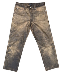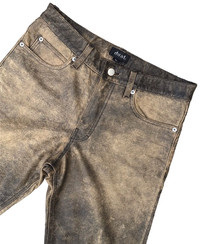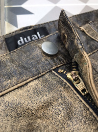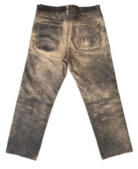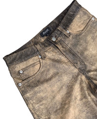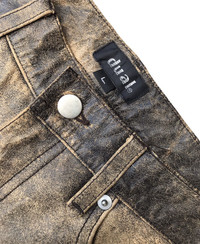 DUAL ( JAPAN ) FADED COWHIDES LEATHER JEANS MADE IN PAKISTAN ( DESIGNED IN JAPAN ) SIZE ON TAG ( L ) 31 INCHES MODEL 052351 MATERIAL COWHIDES / LINING NYLON 100% Dimension: Length : 36 Inches Waist : 31 Inches Inseam : 27 Inches Leg Opening : 7.7 Inches Front Rise : 11 Inches Thigh : 11.2Inches Knee : - Inches Condition: 9/10 Colour: 9/10 CONDITIONS PLEASE SEE PICTURES ► All measurement are in INCHES. PLEASE READ WITH CARE BEFORE BUY Do not hesitate to contact me if you have any questions ● This is not a brand new product. ● All the details are in the photos. ● Any defects are as shown on the photos. ● Please expect few minor defects. ● Photos taken are genuine. No effect or editing is/was done. ● Color may be dissimilar due to sun/lighting. ● Please focus to details and measurement given. ● Make sure the measurement is balance with your wardrobe. RETURN POLICY Refund is applicable only to item that not match the description. Please check your size carefully because no refund can be made due to wrong size. Please send me a message if you have any question. SHIPPING AND CONDITIONS Accepted and most preferred payment is PAYPAL! For other payment methods contact me before buying! Your item will be shipped via FEDEX EXPRESS Tracking number will be given for free. Shipping cost includes handling and shipping cost Please contact me for any questions that you may have about this item and our transaction! If you have any problems during or after the transaction contact me first, without opening a case or leaving negative feedback, and it will be solved. Thanks for looking!