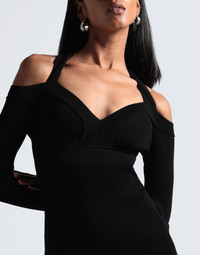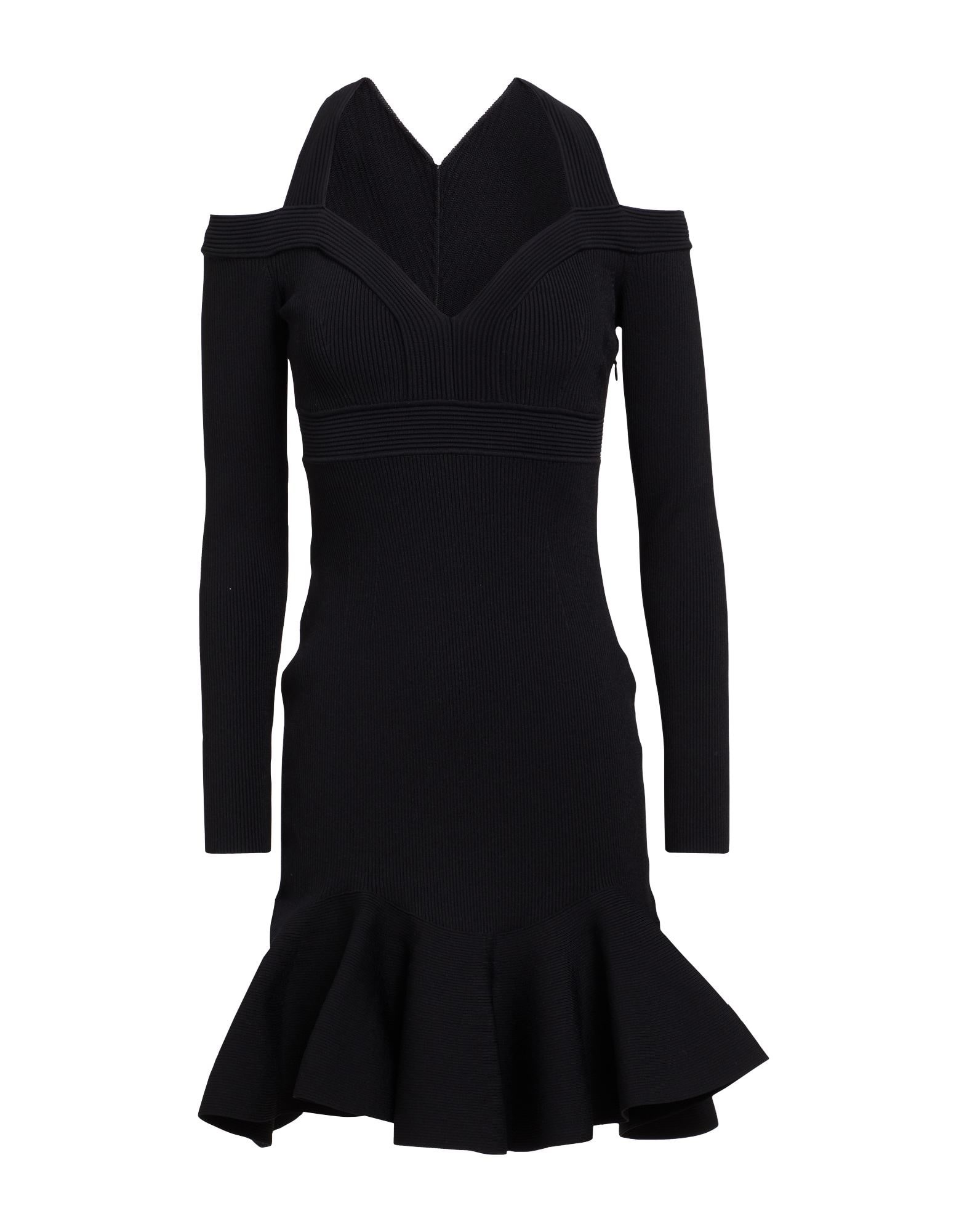 knitted, ribbed, lightweight knit, no appliqués, solid color, v-neck, long sleeves, unlined, zipper fastening, no pockets, frilled hemline, dry clean, do not tumble dry, do not bleach, bodycon dress COMPOSITION 74% Viscose, 15% Polyester, 10% Polyamide, 1% Elastane MEASUREMENTS Length (from the back to the bottom of the dress): 85.0 Product code: 15359469HK