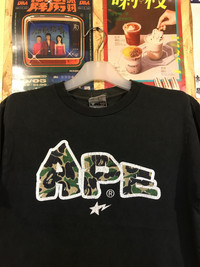 Rare Vintage BAPE Tee – OG Bapesta Lightning Graphic – Made in Japan (Medium) Description: Brand: A Bathing Ape (BAPE) Item: Rare Vintage APE x Bapesta Lightning Graphic Tee Color: Black Size on Tag: Medium Condition: 7/10 – Vintage wear; collar has visible cracking and print shows minor cracking front and back. Description: Rare vintage BAPE tee from the golden era of Japanese streetwear. Features the classic camo "APE" logo on the chest and bold Bapesta lightning print on the back. Tagged Medium, made in Japan. Constructed with single stitch sleeves and hem – a true sign of early BAPE production. A must-have for serious collectors and OG streetwear fans. Measurements: Pit to Pit: 21" Length: 26.5" Details: Collar cracking (due to age) Front and back print cracking Single stitch (sleeves & hem) No holes or major stains Shipping: Shipped via FedEx with tracking. Carefully packed for safe delivery.