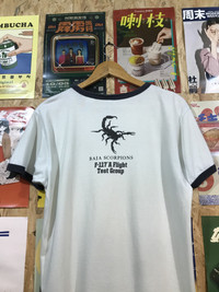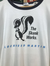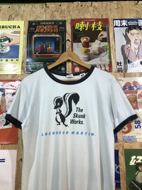 Ultra-rare ringer tee by Buzz Rickson’s, inspired by authentic U.S. military apparel. Features bold graphic of The Skunk Works – Lockheed Martin’s legendary black ops division – with nods to the F-117 Nighthawk stealth fighter and Baja Scorpions flight test group.