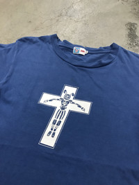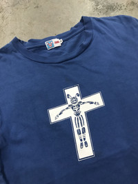 Rare graphic tee from RAB (Real Akiba Boyz) – iconic Japanese dance crew known for their otaku x streetwear aesthetic. Features a bold "[RAB]" print on the back and a robot cross graphic on the front. Vibrant royal blue color.
