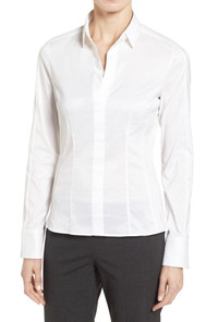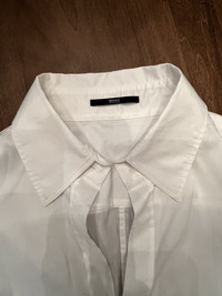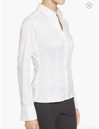 In excellent condition shirt. I wore this as a men small size and it works just fine. slightly smaller point collar updates a favorite shirt expertly tailored from lustrous stretch poplin. The slim and shapely fit stays neat and gap-free, thanks to side-zip closures Finale Sale.