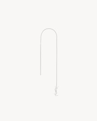 LONG THREADER SINGLE EARRING MADE WITH RECYCLED GOLD, FEATURING A FINE CHAIN AND CASSANDRE PENDANT. GOLD IS A PRECIOUS MATERIAL THAT IS MALLEABLE AND HIGHLY SENSITIVE TO SCRATCHING. THE PRODUCT IS EXPECTED TO EVOLVE AND PRESENT MARKS THROUGHOUT ITS LIFECYCLE. MOREOVER, AS GOLD IS A SOFT ALLOY, PIECES SHOULD NOT BE STACKED ONE ON TOP OF THE OTHER TO AVOID DAMAGING THEM. EVERY PIECE OF JEWELRY MUST BE STORED IN ITS ORIGINAL PACKAGING TO AVOID ANY FRICTION WITH OTHER OBJECTS THAT COULD SCRATCH IT. WHEN PART OF A SET, PIECES MUST BE STOCKED SEPARATELY. - RECYCLED GOLD - EARRING FOR PIERCED EARS - SAINT LAURENT ENGRAVING ON THE INSIDE OF THE CHARM - LENGTH: 16 CM / 6.3 INCHES - 18KT GREY GOLD 750/1000 - STYLE ID 761530Y80028126 - MADE IN FRANCE
