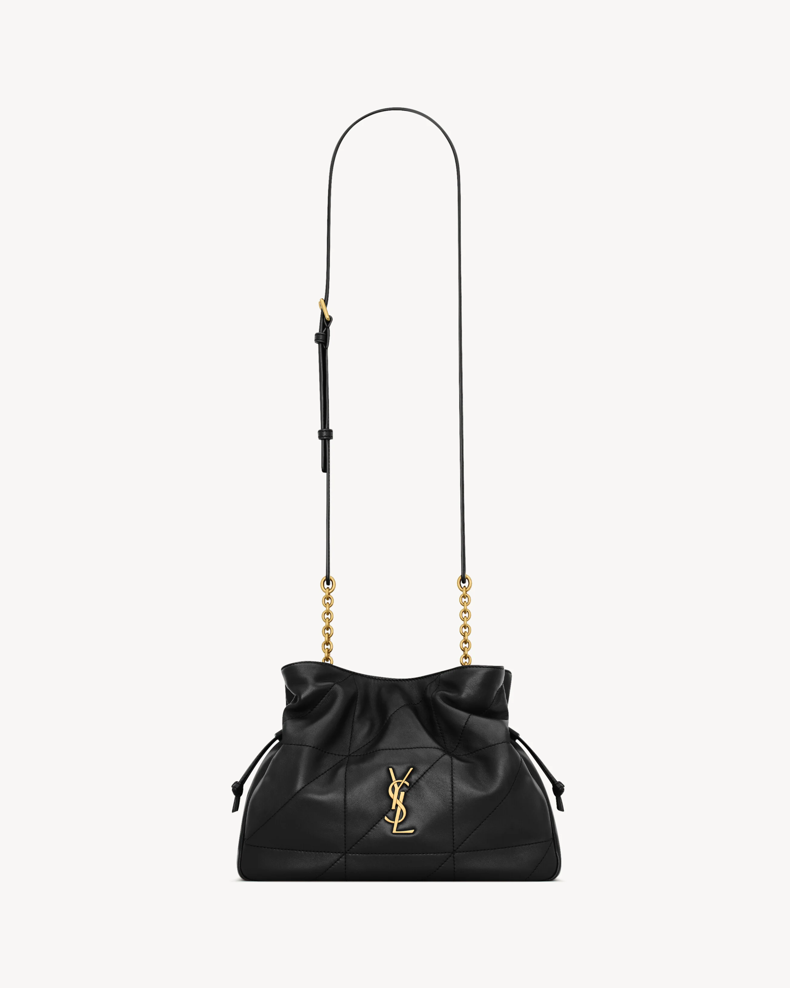 THE SHOULDER POUCH VERSION OF THE JAMIE, DECORATED WITH THE CASSANDRE AND CARRE RIVE GAUCHE TOPSTITCHING. THIS LIGHTWEIGHT AND COMPACT BAG FEATURES A CHAIN STRAP FOR CROSSBODY CARRY. DRAWSTRING TIES ALLOW THE SIDES TO BE CINCHED OR EXPANDED TO CREATE DIFFERENT SILHOUETTES. - LEATHER LINING - BRONZE-TONE HARDWARE - MAGNETIC SNAP CLOSURE - ONE CARD SLOT - DIMENSIONS: 26 X 18 X 12.5 CM / 10.2" X 7.1" X 4.7" - STRAP DROP: 42–54 CM / 16.5–21.3" - LAMBSKIN BRASS - STYLE ID 862712AAB321000 - MADE IN ITALY