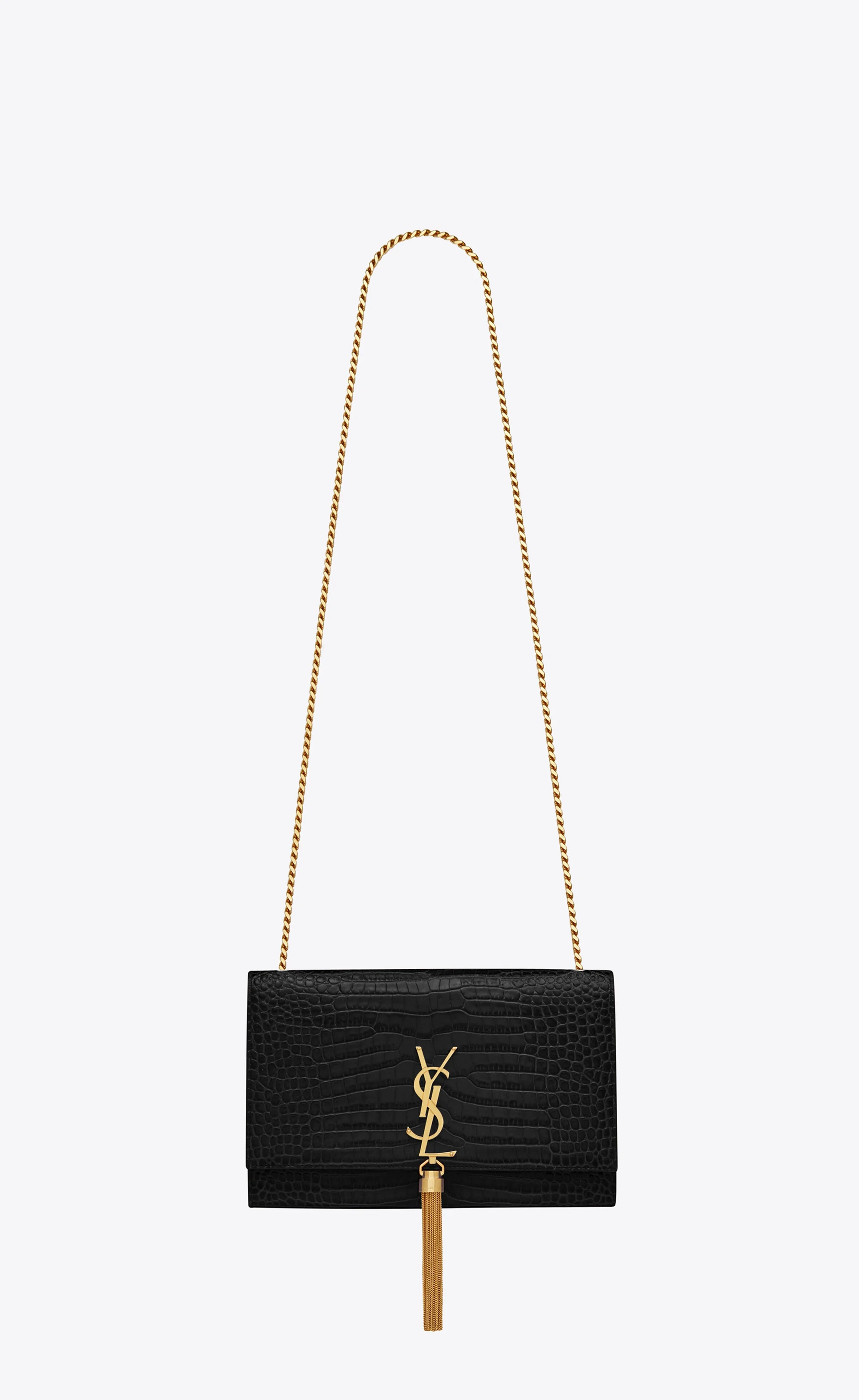 THE ICONIC KATE BAG IN SHINY CROCODILE-EMBOSSED LEATHER, FEATURING THE CASSANDRE AND CHAIN TASSEL. CHIC AND STRUCTURED SHOULDER BAG. - GROSGRAIN LINING - LIGHT BRONZE BRASS HARDWARE - MAGNETIC SNAP TAB - ONE INTERIOR SLOT POCKET - DIMENSIONS: 9.4 X 5.7 X 2.1 INCHES - CHAIN LENGTH: 18.8 INCHES - CALFSKIN LEATHER - STYLE ID 354119DND0J1000 - MADE IN ITALY