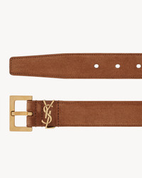 BELT WITH ADJUSTABLE SQUARE BUCKLE FEATURING A METAL YSL MONOGRAM LOOP. - 100% CALFSKIN LEATHER - WIDTH: 3 CM / 1.2 INCHES - BRONZE-TONED METAL HARDWARE - ADJUSTABLE BUCKLE FASTENING - STYLE ID 634437C0X0W6309 - MADE IN ITALY