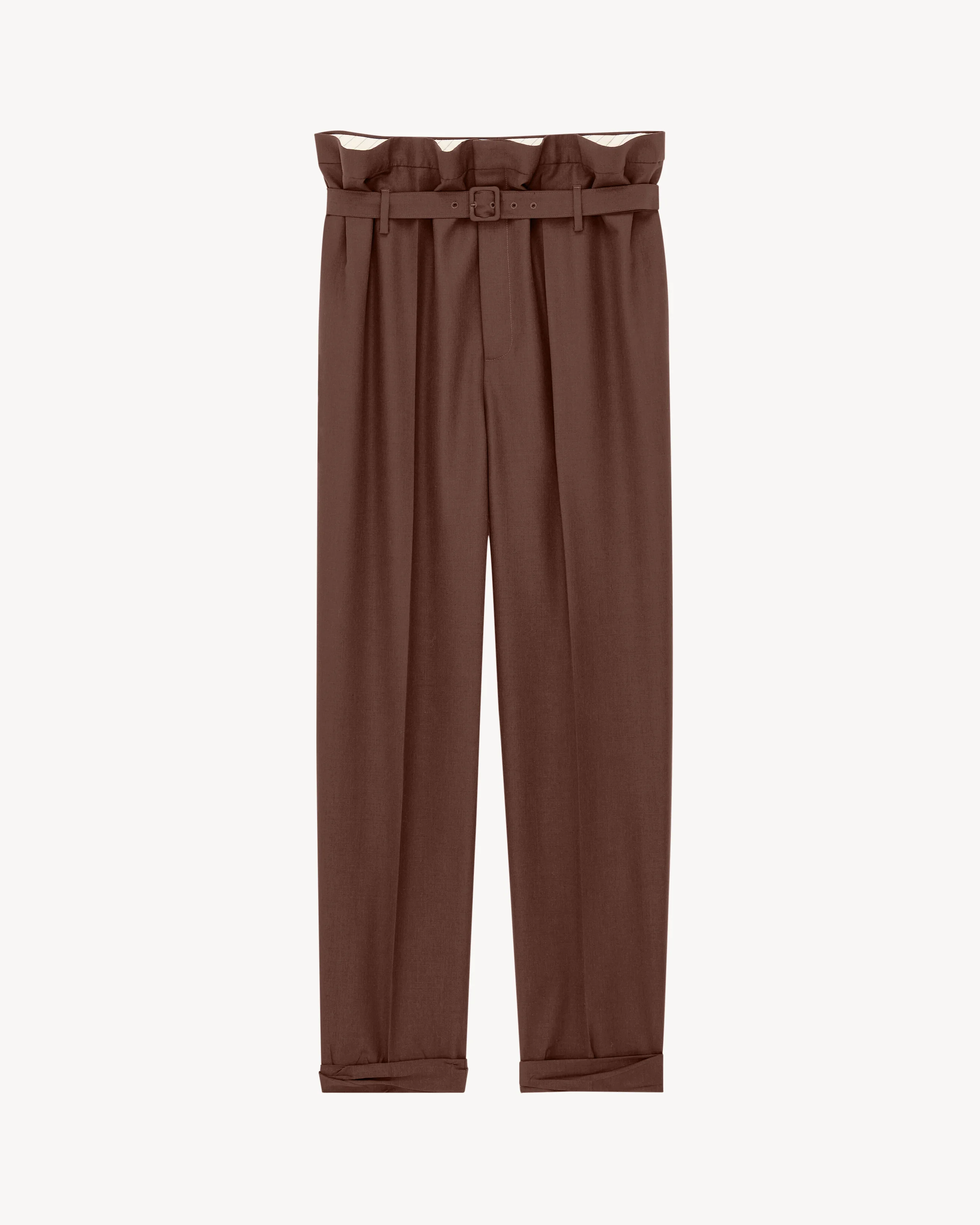 MID-RISE PANTS MADE WITH CERTIFIED WOOL AND CERTIFIED MOHAIR, FEATURING A BELTED PAPERBAG WAIST AND SLIM-FIT LEG WITH A SINGLE PLEAT, CENTER CREASE, AND UPTURNED CUFFS. - CERTIFIED WOOL, CERTIFIED MOHAIR - CONCEALED FRONT BUTTON AND ZIP CLOSURE - TWO CONCEALED SIDE POCKETS - TWO WELT POCKETS AT THE BACK - ADJUSTABLE PIN-BUCKLE BELT - UPTURNED CUFFS - 75% WOOL, 25% MOHAIR - STYLE ID 857058Y1N022019 - MADE IN ITALY