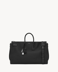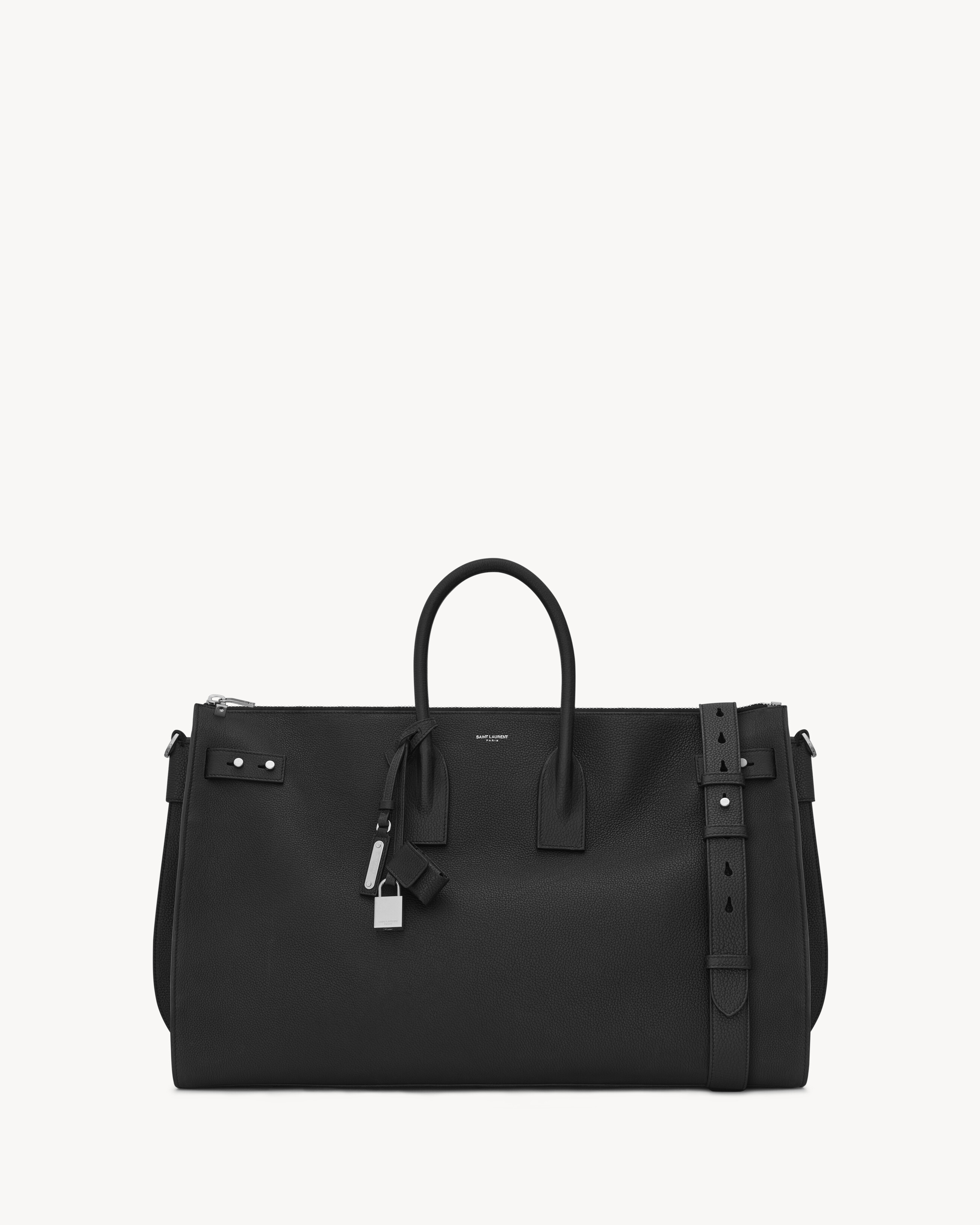 SIGNATURE SAINT LAURENT DUFFLE BAG WITH SOFT CONSTRUCTION, TUBULAR HANDLES, GUSSETED SIDES, COMPRESSION STRAPS WITH TABS, EMBOSSED SAINT LAURENT SIGNATURE AND REMOVABLE, ADJUSTABLE SHOULDER STRAP. - DIMENSIONS: 50 X 32 X 21 CM / 19.6 X 12.5 X 8.2 INCHES - COTTON LINING - OXIDIZED NICKEL HARDWARE - ZIP CLOSURE - REMOVABLE LEATHER STRAP WITH SAINT LAURENT ENGRAVED METAL PLAQUE AND LEATHER ENCASED PADLOCK - LEATHER FEET - INTERIOR ZIP AND SLOT POCKET - CALFSKIN LEATHER - STYLE ID 480584DTI0E1000 - MADE IN ITALY