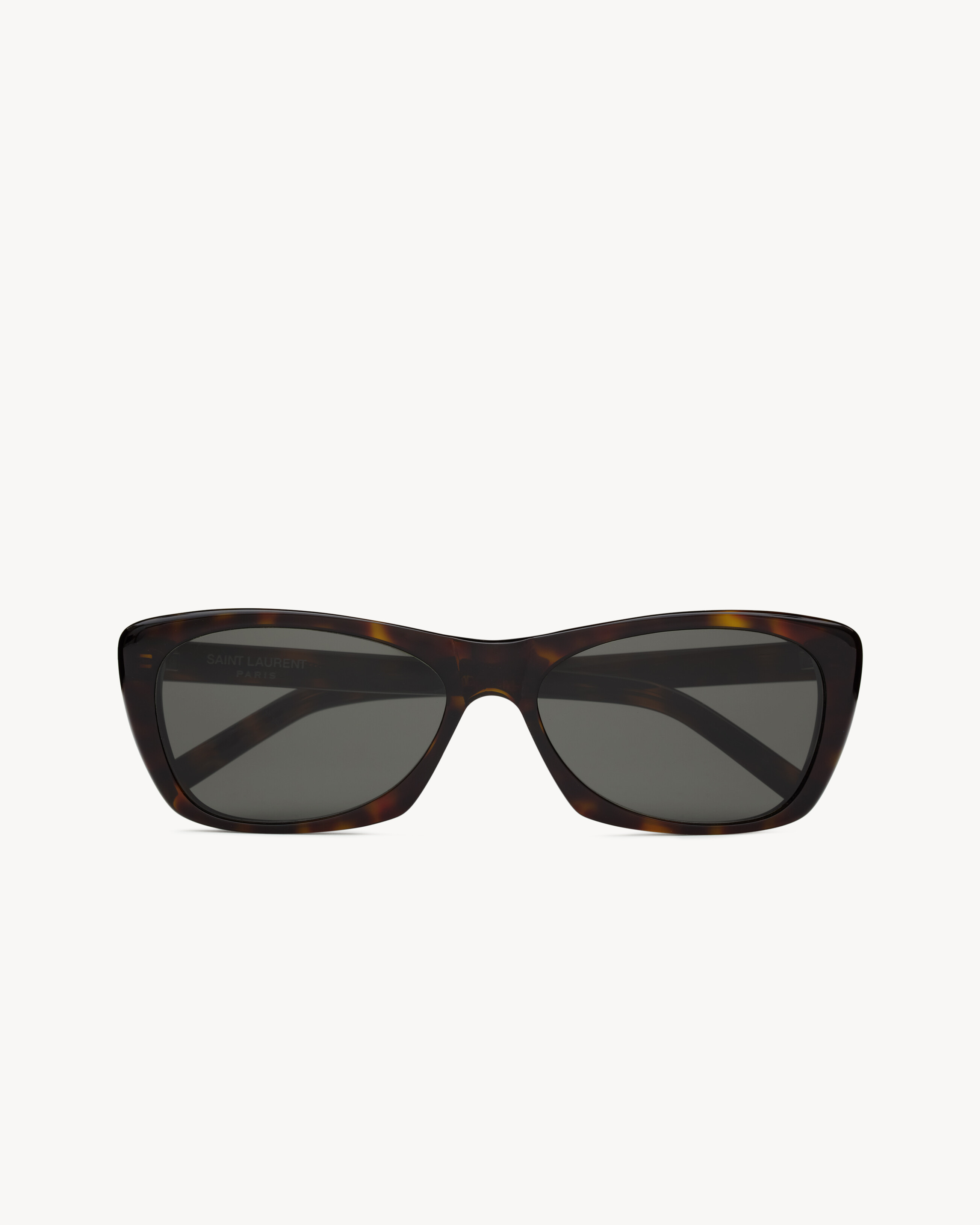 TORTOISESHELL CAT-EYE SUNGLASSES WITH RECTANGULAR ACETATE FRAMES AND NYLON LENSES. - SAINT LAURENT ENGRAVED TEMPLES - 100% UVA/UVB PROTECTION - FRAMES NOT COMPATIBLE WITH PRESCRIPTION LENSES - LENS: 58 MM / 2.3" - BRIDGE: 16 MM / 0.6" - TEMPLE: 140 MM / 5.5" - 80% RECYCLED ACETATE, 20% BIO NYLON - STYLE ID 758444Y99562338 - MADE IN ITALY