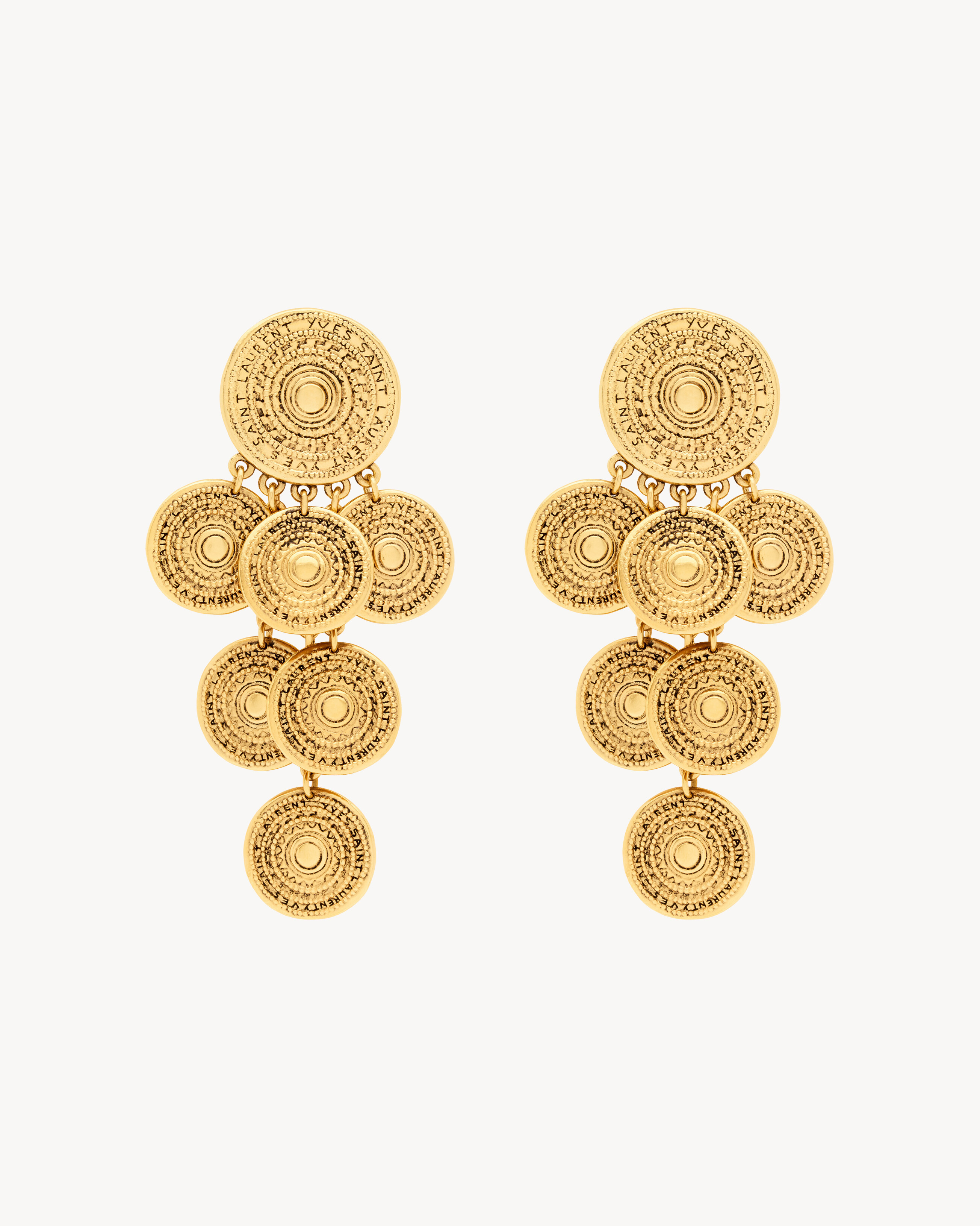 PENDANT EARRINGS WITH TEXTURED YVES SAINT LAURENT MEDALLION CHARMS. - CLIP-ON CLOSURE - SAINT LAURENT ENGRAVING - LENGTH: 10 CM / 3.9" - METAL - STYLE ID 820145Y15008060 - MADE IN THAILAND