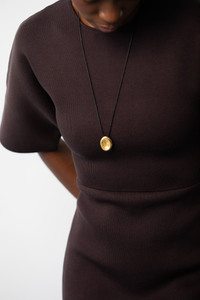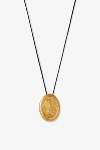 THE DESIGN STORY Aesop was a Greek fabulist and storyteller. We created the Aesop necklace to honour the art of storytelling and its place in the modern experience. The small golden pendant resembles a wax stamp suspended by a contrasting black string. Details Made in Greece, from up to 35% recyclable bronze double plated with 18 and 24 karat gold. Artfully hand-sculpted, fully adjustable.
