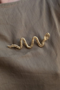 Ophis' — the Greek word for snake — has long represented transformation, wisdom, and protection. The Ophis Pin distills this powerful symbol into a finely detailed form, designed to be worn on a lapel, collar, scarf, or anywhere a subtle statement is called for. Inspired by the sinuous curves of classical Greek jewellery, the snake appears mid-motion — coiled with intent, elegant yet alert. In antiquity, serpents were seen as guardians of sacred spaces and emblems of rebirth, shedding their skin to begin anew. Details Made in Greece, from up to 35% recyclable bronze double plated with 18 and 24 karat gold. Artfully hand-sculpted with a secure pin. Weighs 26 grams.