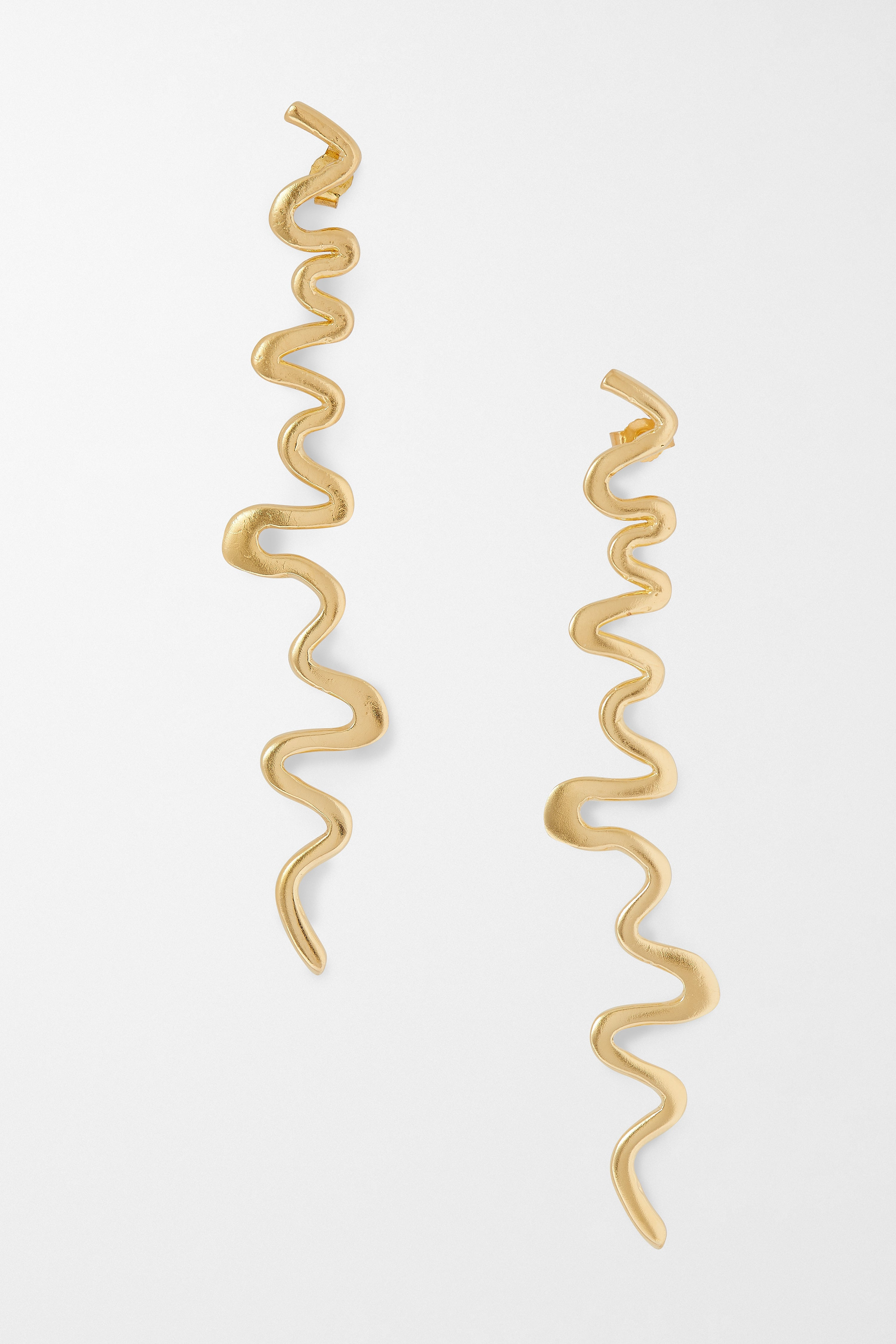 THE DESIGN STORY A celebration of the beauty and movement of waves. Crafted with a graceful touch, our Shore earrings emulate the mesmerising effect of the ocean. Swaying gently with each turn of the head, these elongated, lightweight earrings complete any look. Details Made in Greece, from up to 35% recyclable bronze double plated with 18 and 24 karat gold. Artfully hand-sculpted for ultra-lightweight feel. Designed with a post-back. L: 9 cm W: 1 cm Each side weighs 4.8 grams.