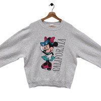 Materials: cotton 50, polyester 50 ITEM DETAIL ATTENTION The size on the tags label may vary with your actual size, please compare the manual measurement with your own body before buy!!! ( All measurements were taken lying flat). Label Size : L Chest : 24 inch Length : 27 inch Shoulder : 24.5 inch Sleeve : 24 inch CONDITION :- = Used = Good vintage – minor stain on back (see photos) = Refer Pictures For More Detail - Color: Heather grey - Graphic: Minnie Mouse with “CALIFORNIA” text - Fit: Unisex crewneck - Vibe: Playful, nostalgic, and effortlessly cool IMPORTANT PLEASE LEAVE YOUR PHONE NUMBER ON THE NOTE WHILE MAKE A PURCHASE Whether you're a Disney collector or just love a good throwback, this sweatshirt is a standout. Bring a touch of West Coast nostalgia to your wardrobe with this vintage Minnie Mouse sweatshirt. Featuring Minnie in her signature polka-dot dress and sunglasses, alongside bold “CALIFORNIA” lettering, this grey pullover is a cozy nod to classic Disney style. Crafted for comfort with a relaxed unisex fit, it’s perfect for layering or lounging. Please note: there is a small stain on the back (see photos), which adds to its authentic vintage character without affecting wearability. Ref : a36 Thank you and HAPPY SHOPPING