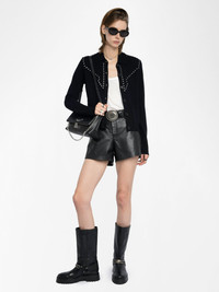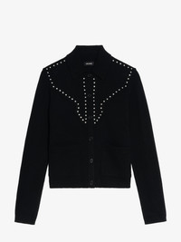 Knit jacket with shirt collar and metallic stud details. Description & details - Cardigan in wool and cashmere - Metallic stud details - Shirt collar - Button fastening - Patch pockets - Long sleeves Model is 180 cm / 5' 10" and is wearing a size S This item fits true to size. Choose your usual size. Composition 90% Wool 10% Cashmere Care - Hand-wash or machine-wash on a 20°C wool cycle with a maximum spin speed of 400 rpm - Do not wring - Air dry flat - Iron inside out at a maximum of 110°C, avoiding any customised details Product code: KWCA01648_BLACK