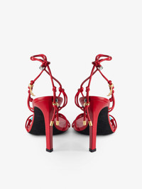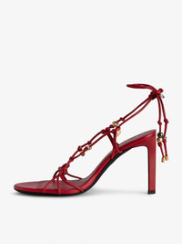 Red smooth leather heeled sandals with tied straps and charms. Description & details - Women’s Power red smooth leather sandals - Adjustable tied crossover straps with charms - Heel height: cm - Made in Portugal This item runs small. We recommend buying one size larger than your usual size. Composition 100% LAMBSKIN Care - Lambskin is extremely fragile and deserves to be treated with delicacy - Protect your leather item from humidity and any source of heat (radiator, sun) - Avoid your item coming into contact with water - Regularly maintain the shine of your smooth or grained leather shoes with a leather polish Product code: SWCT00848_POWER