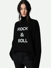 Women’s black turtleneck sweater with slogan Description & details A soft, fluffy wool knit with an unmistakeably rock “n” roll style: this is an absolute must-have sweater. - Zadig&Voltaire women’s black merino wool sweater - Turtleneck - Long sleeves - “ROCK & ROLL” inscription on the front - Ribbed neck, cuffs and waist Model is 179cm/5'10.5" and is wearing a size M Model is 179 cm / 5' 10" and is wearing a size M This item is true to size. We recommend buying your usual size. Composition 100% WOOL MERINOS Care Hand or machine wash your knitwear at 20°C in a pillowcase or washing bag. Do not use fabric softener or leave your knit soaking in water. The spin speed must not exceed 400 rpm. Dry flat on a towel away from direct sunlight and heat. Product code: PWHMZ1101F_NOIR