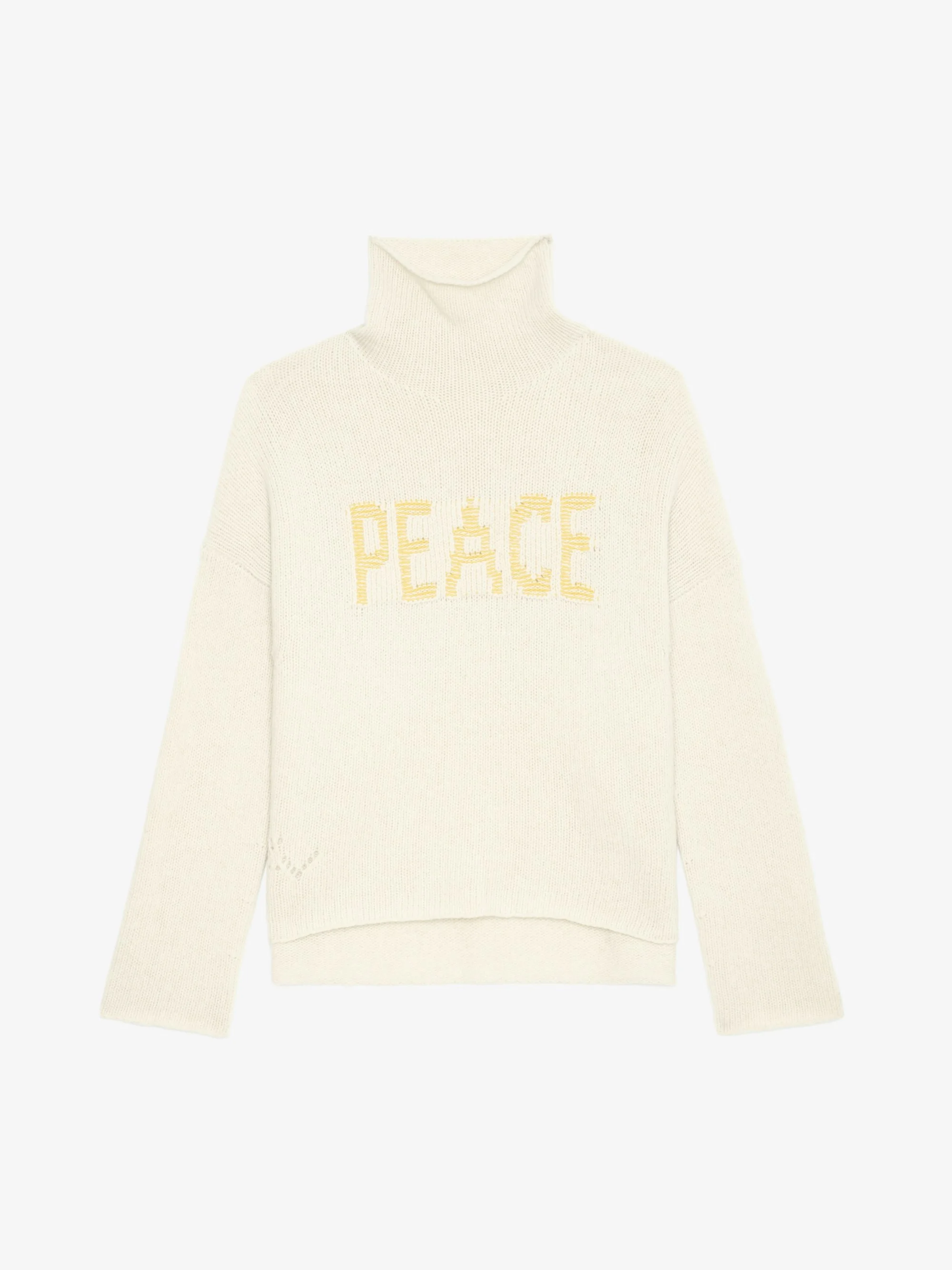 Long, loose-fitting, light yellow merino wool sweater with funnel neck and "Peace" message in contrasting tweed. Description & details - Women's long, loose-fitting sweater in Latte light yellow merino wool - Jacquard intarsia "Peace" message in contrasting tweed on front - Funnel neck - Long sleeves and rolled ribbed edges - Pointelle ZV signature and side slits Model is 178 cm / 5' 10" and is wearing a size S This item is true to size. We recommend buying your usual size. Composition 100% Merino wool* Care - Hand-wash or machine-wash on a 20°C wool cycle with a maximum spin speed of 400 rpm - Do not wring - Air dry flat - Iron inside out at a maximum of 110°C, avoiding any customised details Product code: KWSW01649_LATTE
