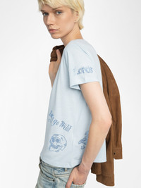 Short-sleeved T-shirt with multi-custom rhinestones. Description & details - T-shirt - Multi-custom rhinestone inscriptions - Crew neck - Short sleeves Model is 180 cm / 5' 10" and is wearing a size S This item fits true to size. Choose your usual size. Composition 50% Polyester* 30% Cotton 20% Linen* Care - Machine-wash inside out on a 30°C delicate cycle with similar colours - Air dry - Iron inside out at a maximum of 110°C, avoiding any customised details Product code: JWTS02818_CLOUD