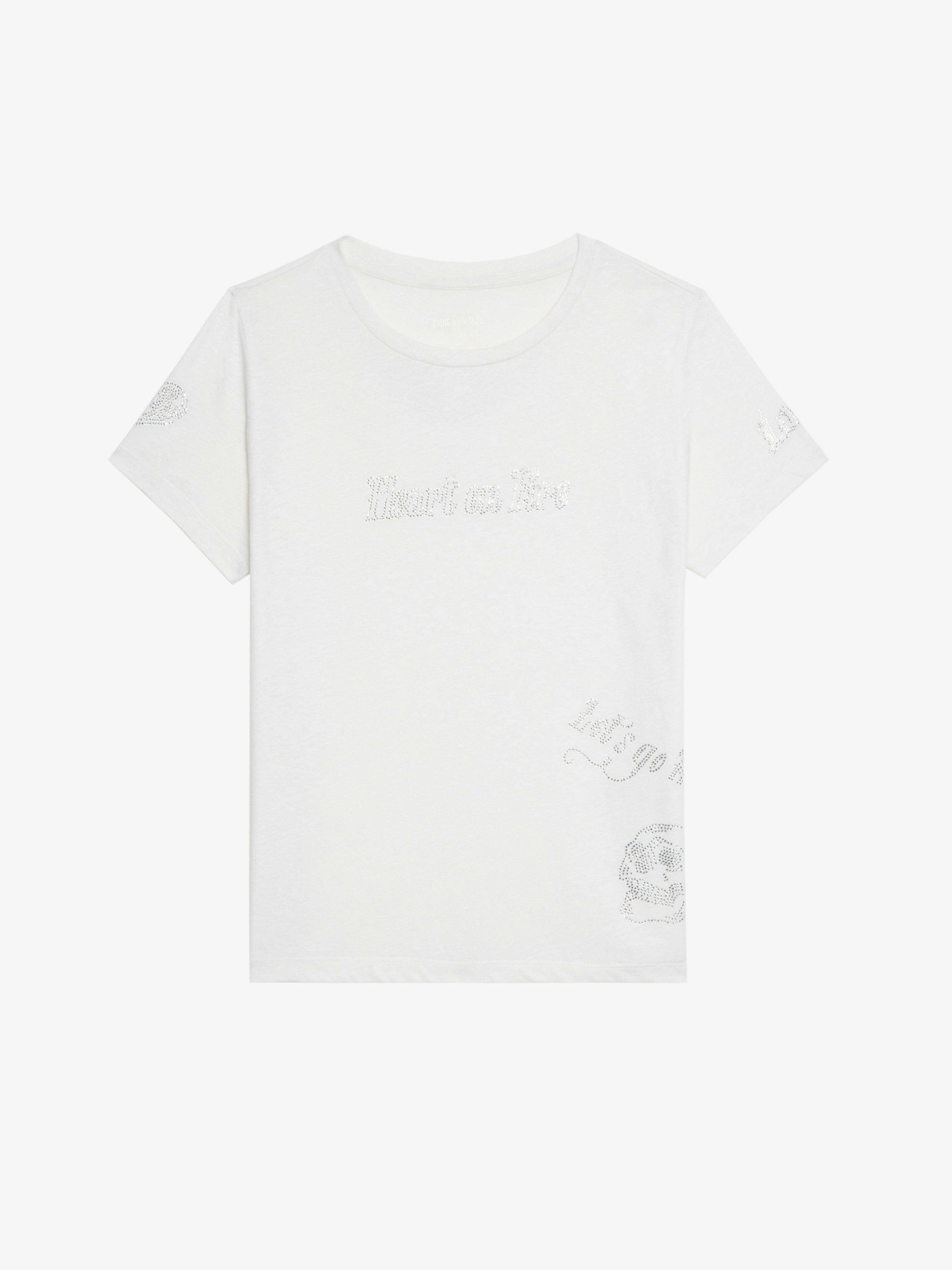 Short-sleeved T-shirt with multi-custom rhinestones. Description & details - T-shirt - Multi-custom rhinestone inscriptions - Round neck - Short sleeves Model is 177 cm / 5' 9" and is wearing a size S This item fits true to size. Choose your usual size. Composition 50% Polyester* 30% Cotton 20% Linen* Care - Machine-wash inside out on a 30°C delicate cycle with similar colours - Air dry - Iron inside out at a maximum of 110°C, avoiding any customised details Product code: JWTS02818_JUDO