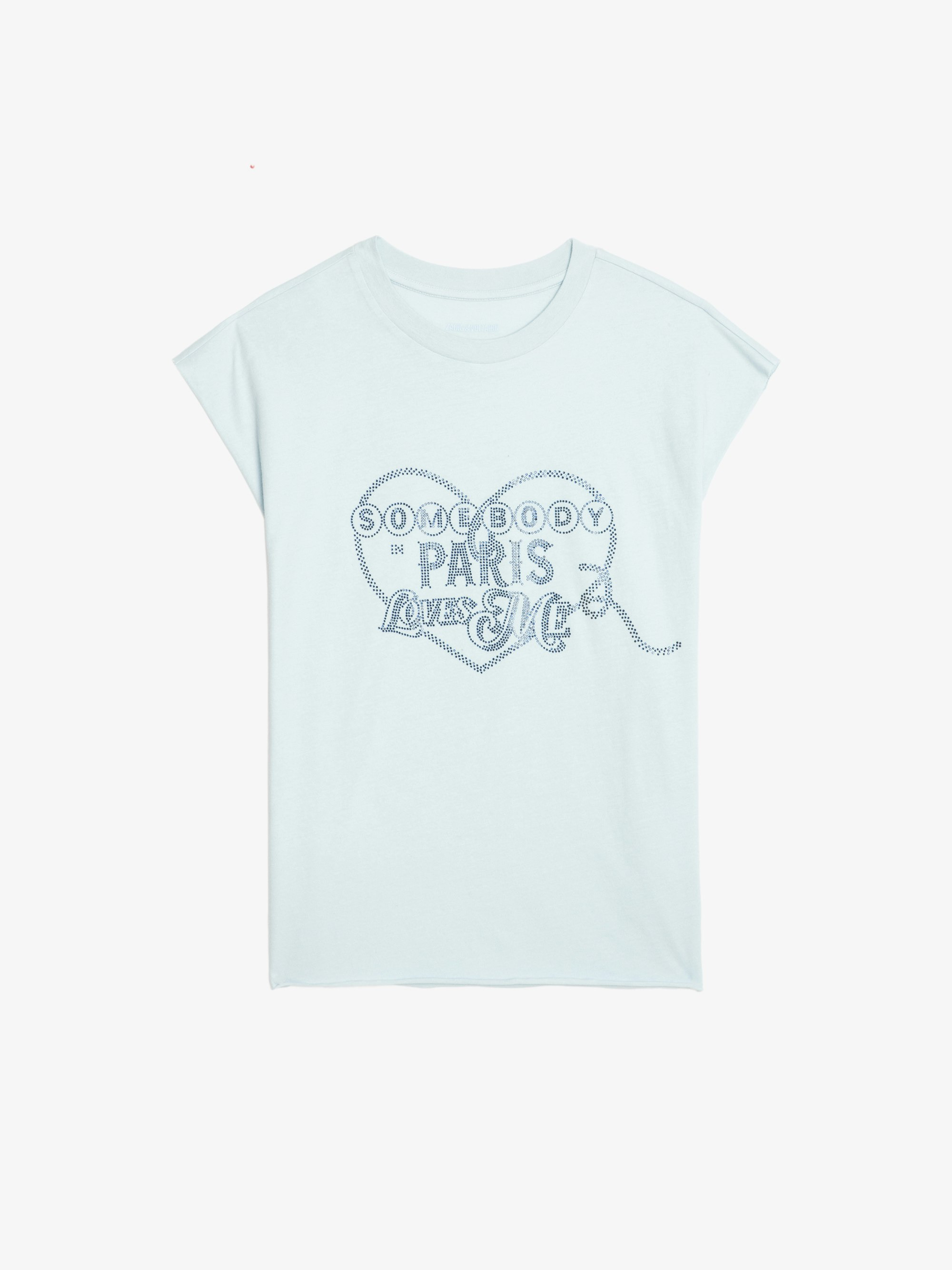 Sleeveless T-shirt with rhinestone print on the front. Description & details - Tank top in 100% cotton - Round neck - "Somebody in Paris loves me" rhinestone print on the front Model is 175 cm / 5' 8" and is wearing a size S This item has a loose fit. For a more fitted look, choose one size down from your usual size. Composition 100% Cotton** Care - Machine-wash inside out on a 30°C delicate cycle with similar colours - Air dry - Iron inside out at a maximum of 110°C, avoiding any customised details Product code: JWTT01270_CLOUD