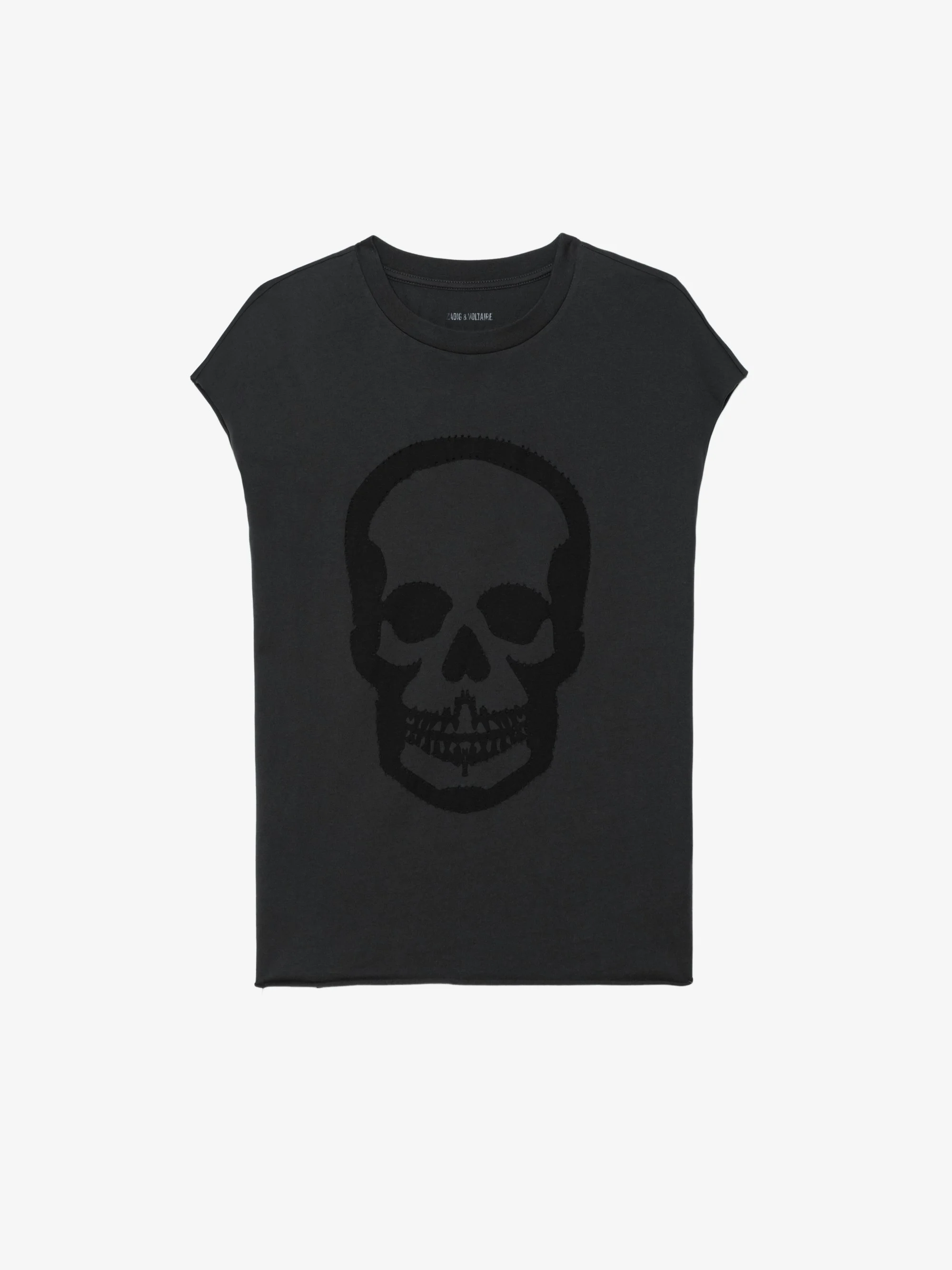 Sleeveless round neck t-shirt with print and small holes on the front. Description & details - Tank top in 100% cotton - Skull print - Round neckline - Small holes on the front Model is 178 cm / 5' 10" and is wearing a size S This item fits true to size. Choose your usual size. Composition 100% Cotton* Care - Machine-wash inside out on a 30°C delicate cycle with similar colours - Air dry - Iron inside out at a maximum of 110°C, avoiding any customised details Product code: JWTT01290_CARBONE
