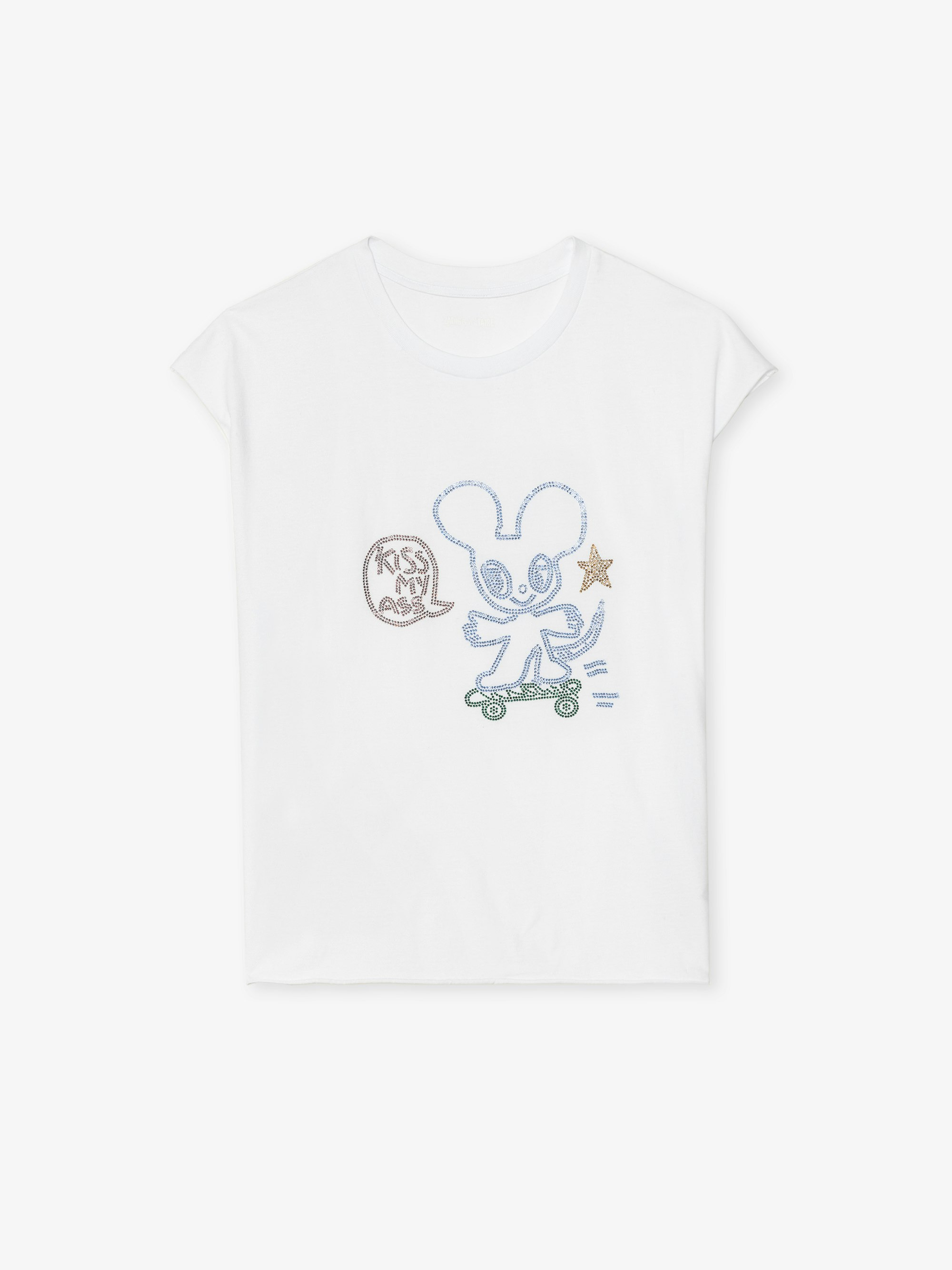 Sleeveless T-shirt with rhinestones on the front. Description & details - Sleeveless tank top in 100% cotton - Rhinestone print on the front - Round neck Model is 180 cm / 5' 10" and is wearing a size S This item fits true to size. Choose your usual size. Composition 100% Cotton* Care - Machine-wash inside out on a 30°C delicate cycle with similar colours - Air dry - Iron inside out at a maximum of 110°C, avoiding any customised details Product code: JWTT01276_WHITE