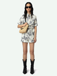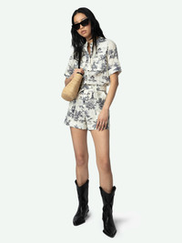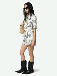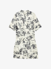 Short safari-style jumpsuit in printed cotton, short sleeves and waist belt. Description & details - Short safari-style jumpsuit in cotton - Tropical Island print - Round neck and button fastening - Waist belt - Short sleeves - 2 chest flap pockets, 2 side Italian pockets and 2 patch pockets on the back Model is 171 cm / 5' 7" and is wearing a size 36 This item is true to size. We recommend buying your usual size. Composition 100% Cotton* Care - Machine-wash inside out on a 30°C delicate cycle with similar colours - Air dry - Iron inside out at a maximum of 110°C, avoiding any customised details Product code: WWJU01039_ECRU