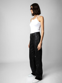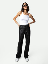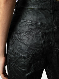 Women’s flared pants in black crinkled leather Description & details The brand’s signature material, crinkled leather, is featured on these casual black flared pants. - Zadig&Voltaire women’s flared pants in black crinkled leather - Zipper and button closure - 2 flap pockets - 2 patch pockets on back - Zadig&Voltaire’s signature material, the crinkled leather comes from a multi-step process developed by the brand, guaranteeing a unique product that incorporates exceptional know-how. Model is 177 cm/5'9" and is wearing a size S Model is 177 cm / 5' 9" and is wearing a size 36 This item is true to size. We recommend buying your usual size. Composition 100% LAMBSKIN Care Do not expose your item to a source of heat or to sunlight for a prolonged period. In the event of accidental exposure to water, leave your item to dry at room temperature, away from direct light. To maintain the shine of your smooth or crumpled leather item, use a leather cream or polish. If your item needs cleaning, we recommend contacting a leather specialist. Product code: RWPA00069_NOIR