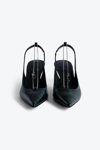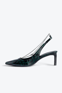 Women’s green leopard-print patent leather court shoes with chain. Description & details - Women’s Abyss green patent leather court shoes - Leather strap and silver-tone metal chain with wings charm - Heel height: 2.7 in - Made in Portugal If you’re between two sizes, we recommend choosing the larger size. Composition 100% GOAT LEATHER Care - Protect your leather item from humidity and any source of heat (radiator, sun) - Avoid your item coming into contact with water - Regularly maintain the shine of your smooth or grained leather shoes with a leather polish Product code: SWCT00829_ABYSS